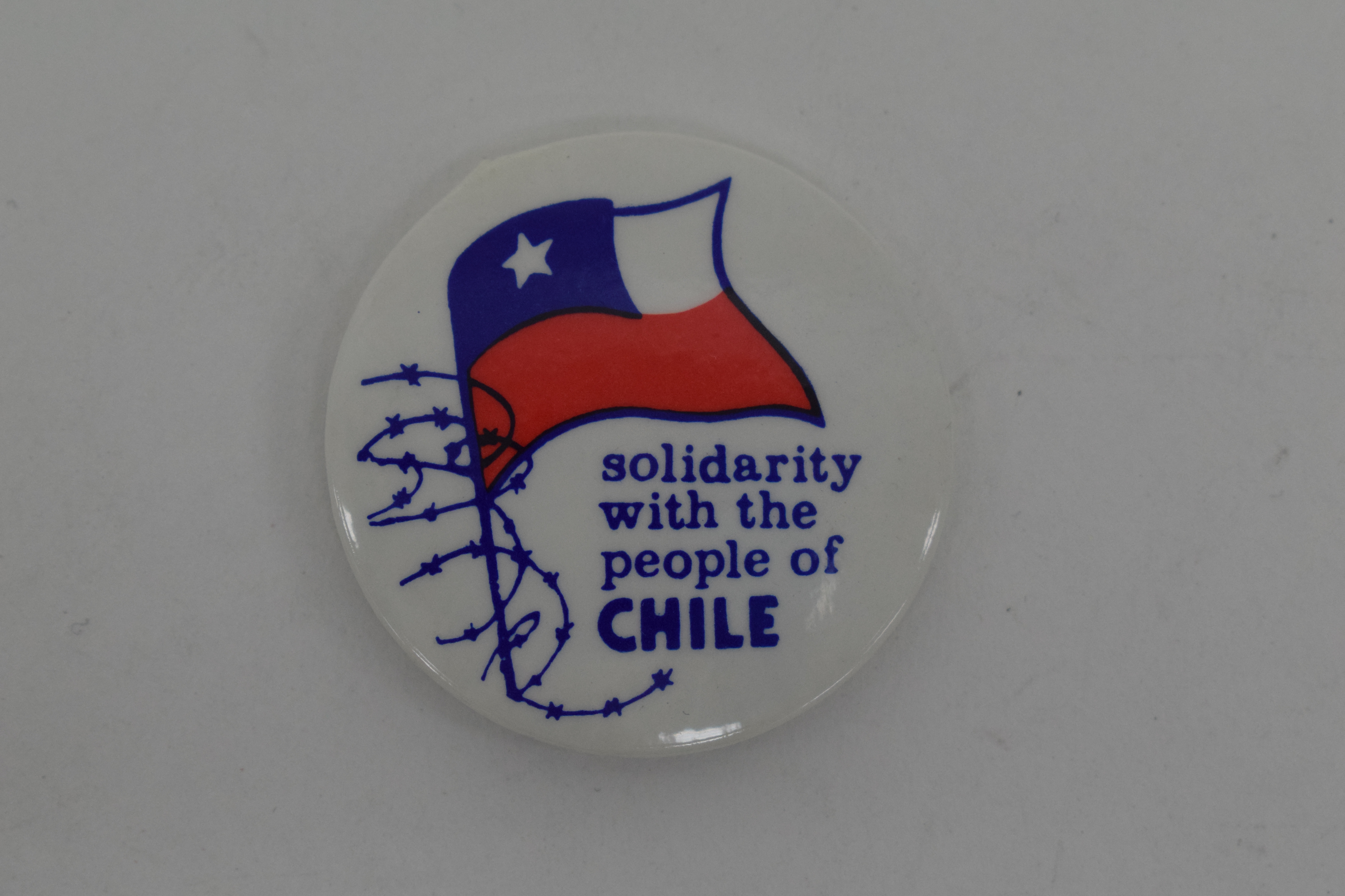 Round white badge with the national flag of Chile, red, white and blue with a white star on the blue square. Overlaid on the flag is barbed wire and text "solidarity with the people of Chile".