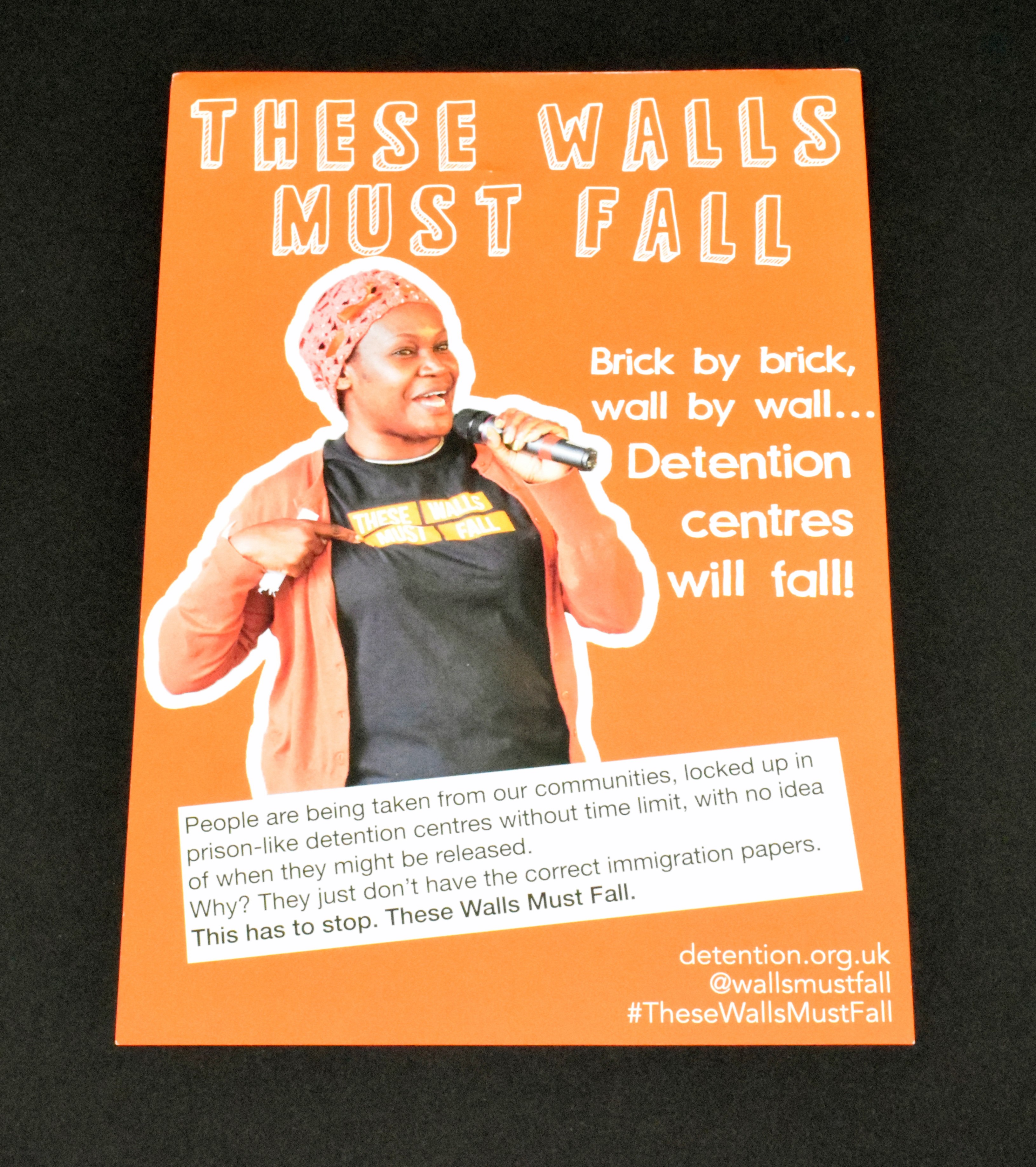 An orange leaflet showing a Black woman in a head scarf, and black 'These Walls Must Fall' t-shirt, speaking into a microphone. Around the photo are the words 'These Walls Must Fall. Brick by brick, wall by wall... Detention centres will fall!' and a paragraph describing immigration detention as inhumane. The reverse is an illustration of the inside of a prison, titled 'What is immigration detention?' with facts about the topic in yellow boxes covering the illustration.