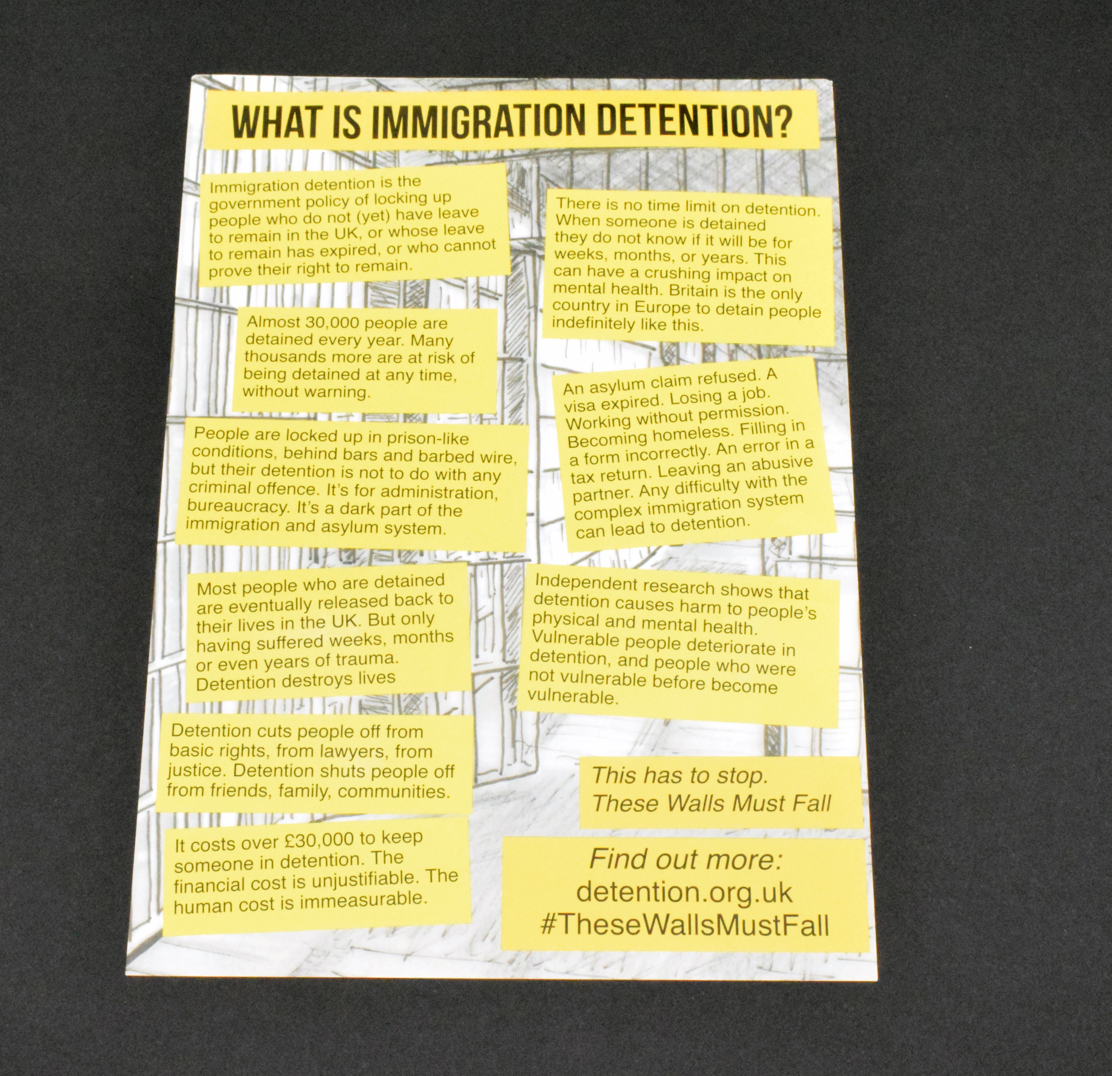 These Walls Must Fall is a migrant rights campaign which campaigns against immigration detention and the hostile environment policies which criminalise migrants in the UK. They highlight the long term mental and physical health impacts of detention on migrants, the cost of detention (£160 million a year at the time of publication), and the lack of time limit on immigration detention.