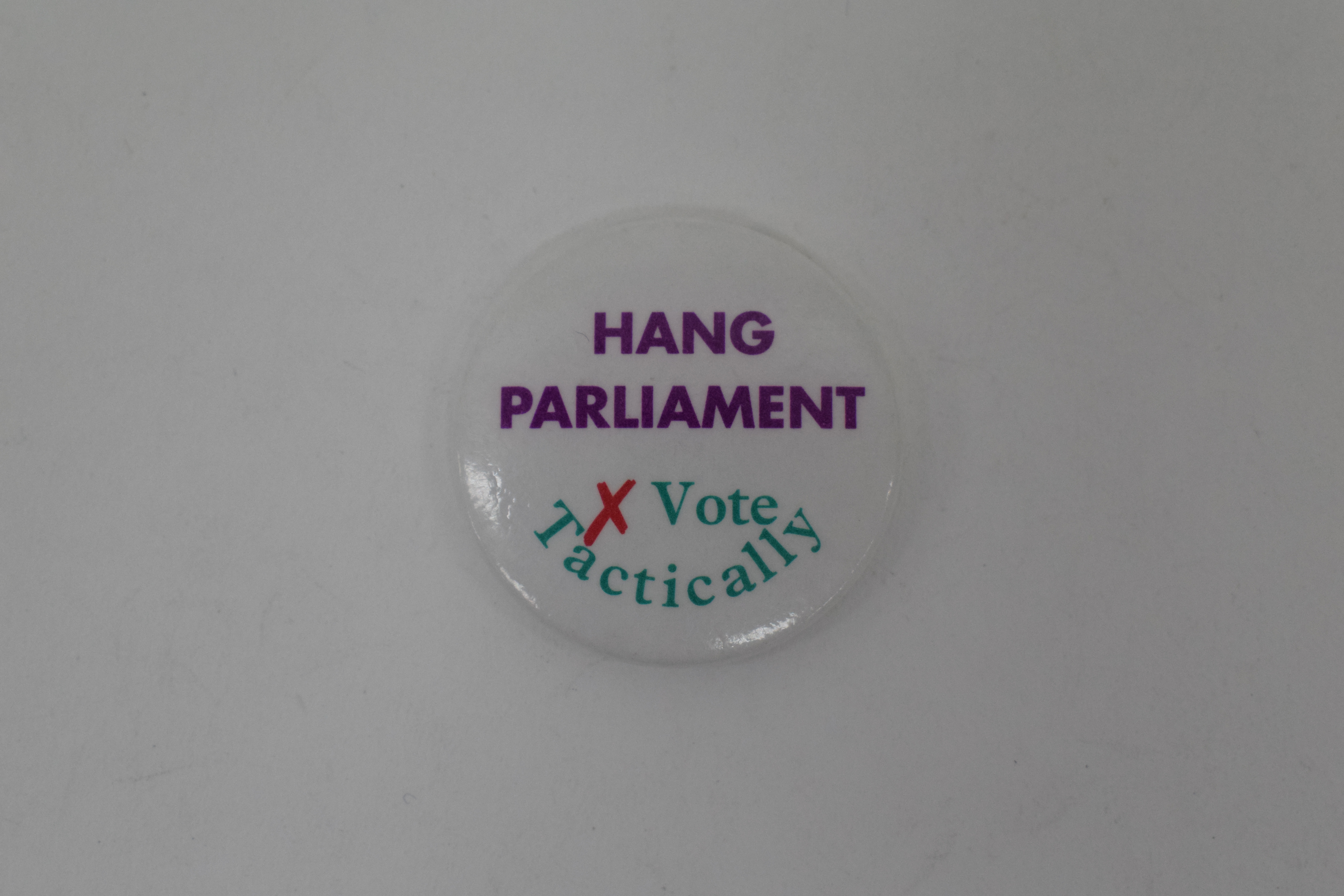 "Hang Parliament Vote Tactically badge" [NMLH.2004.23.2.4]