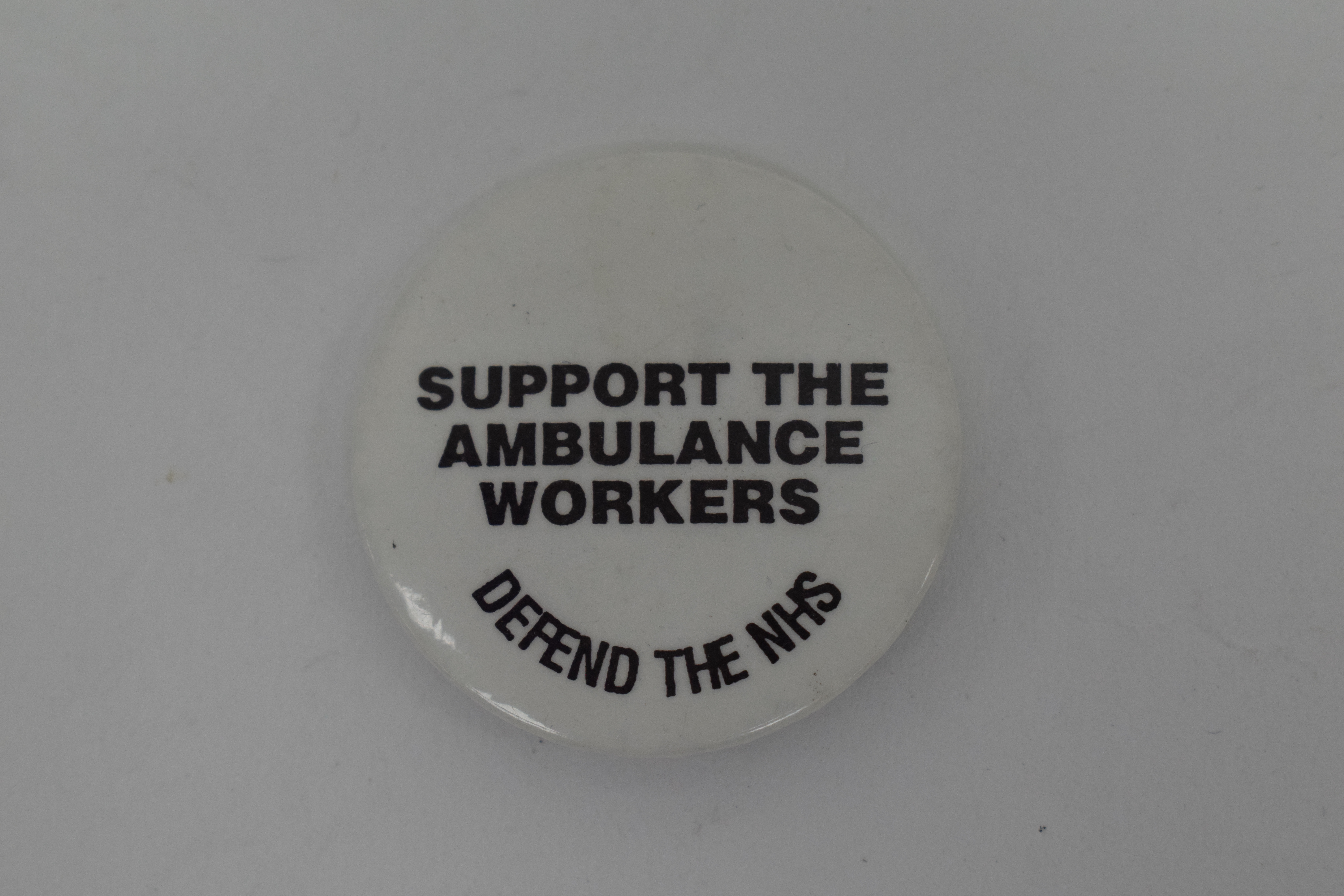 Circular white badge, "Support the ambulance workers - Defend the NHS" [National Health Service].