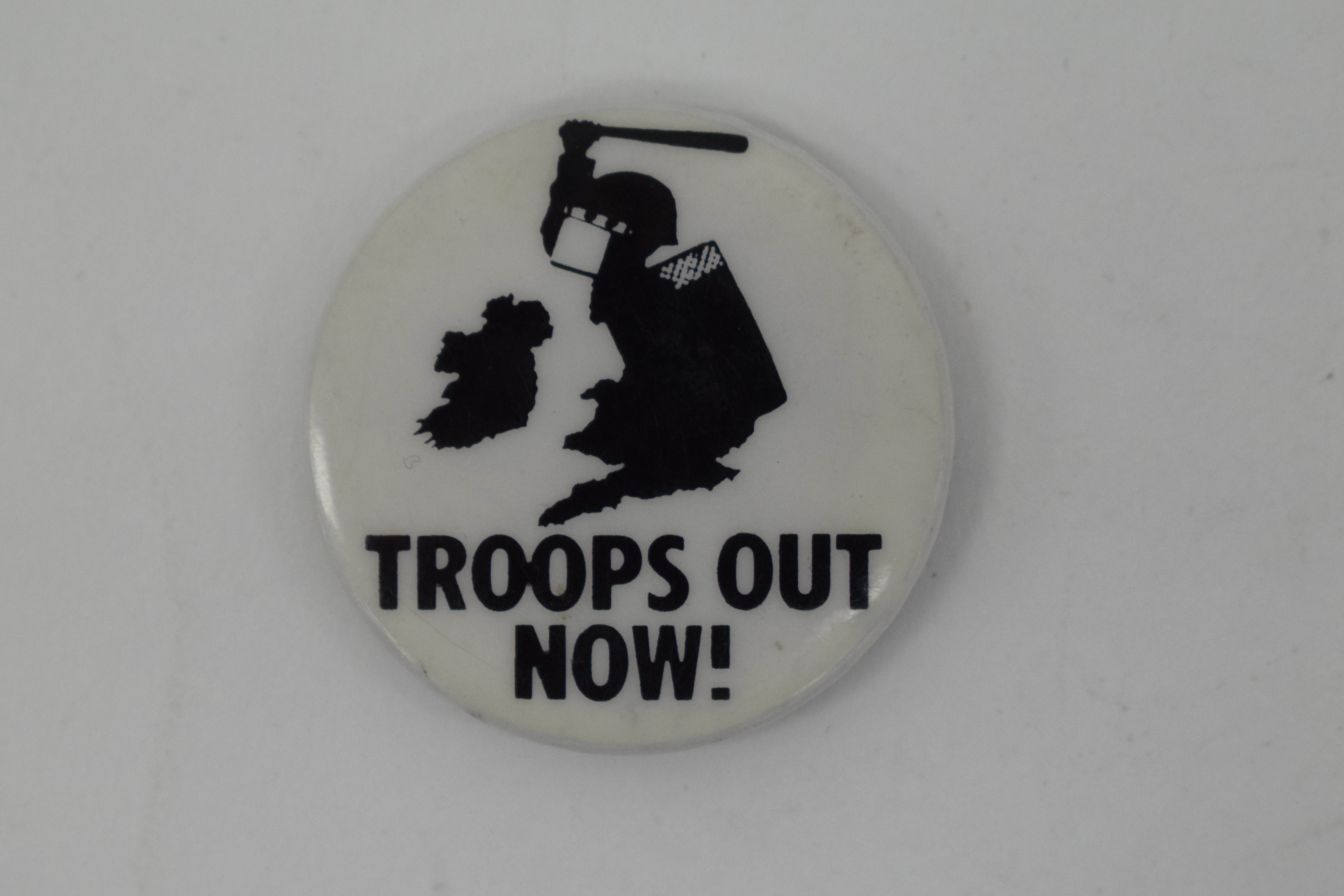 Round white badge, "Troops Out Now!" in black text. Above is a black silhouette map of the UK and Ireland. The shape of England and Scotland is adjusted to look like a police or military person lifting a baton over their head, aimed at Ireland.