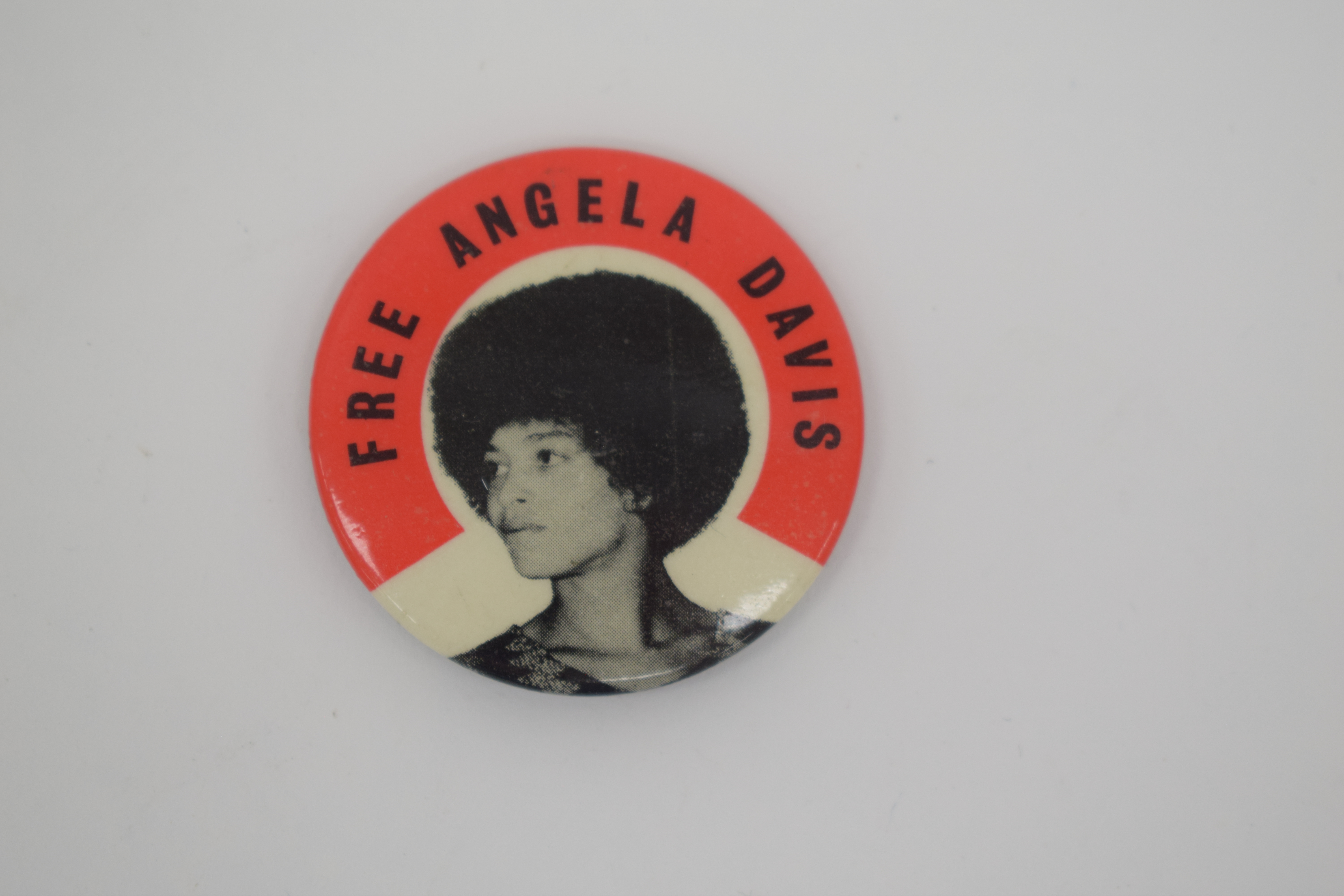 Round white and red badge, "Free Angela Davis" in black around the top edge. In the centre is a black and white photograph of Angela Davis.