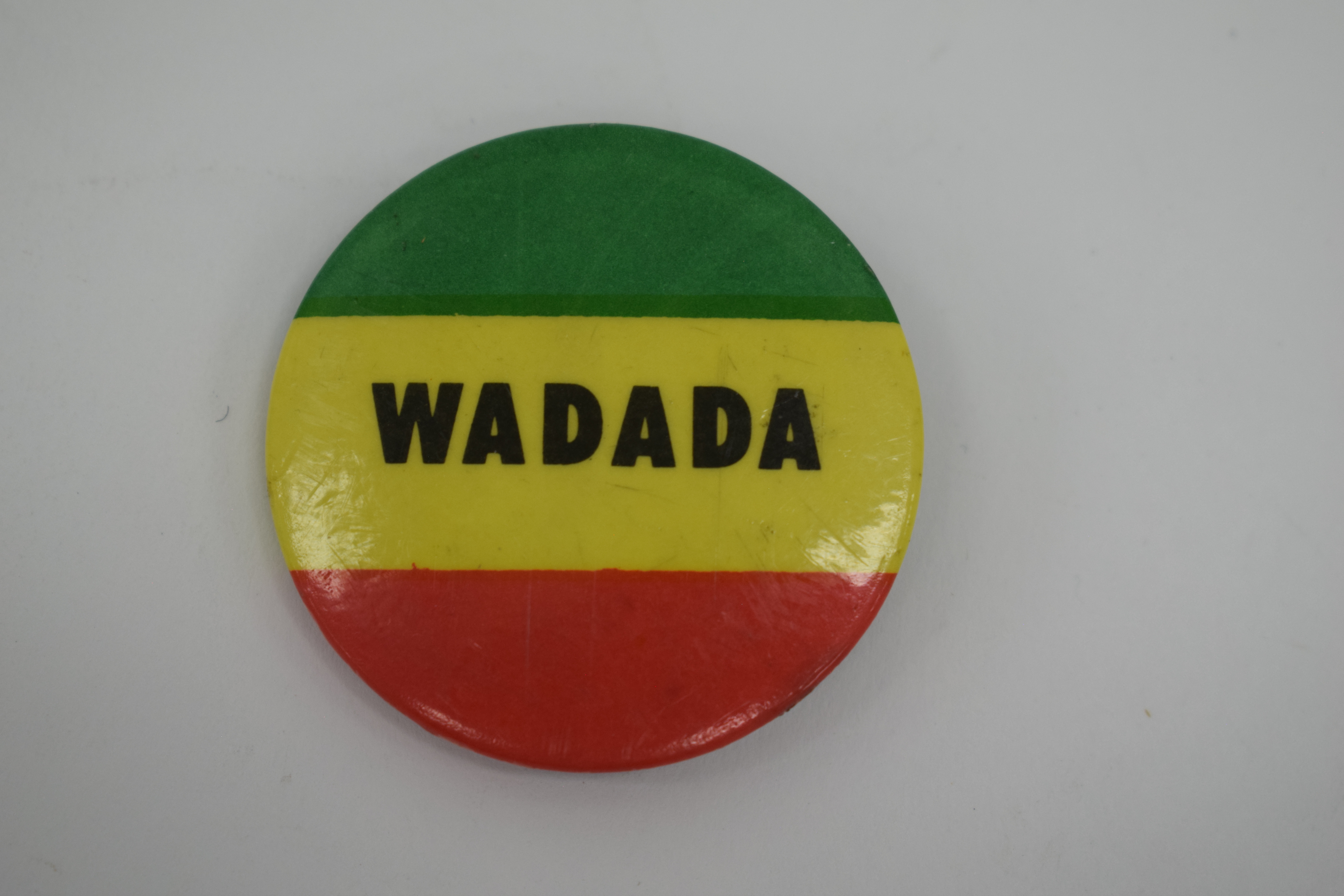 Round badge with horizontal stripes of green, yellow and red - which may be referencing the colours and pattern of the flag of Ethiopia. In the centre stripe is "Wadada" in black.