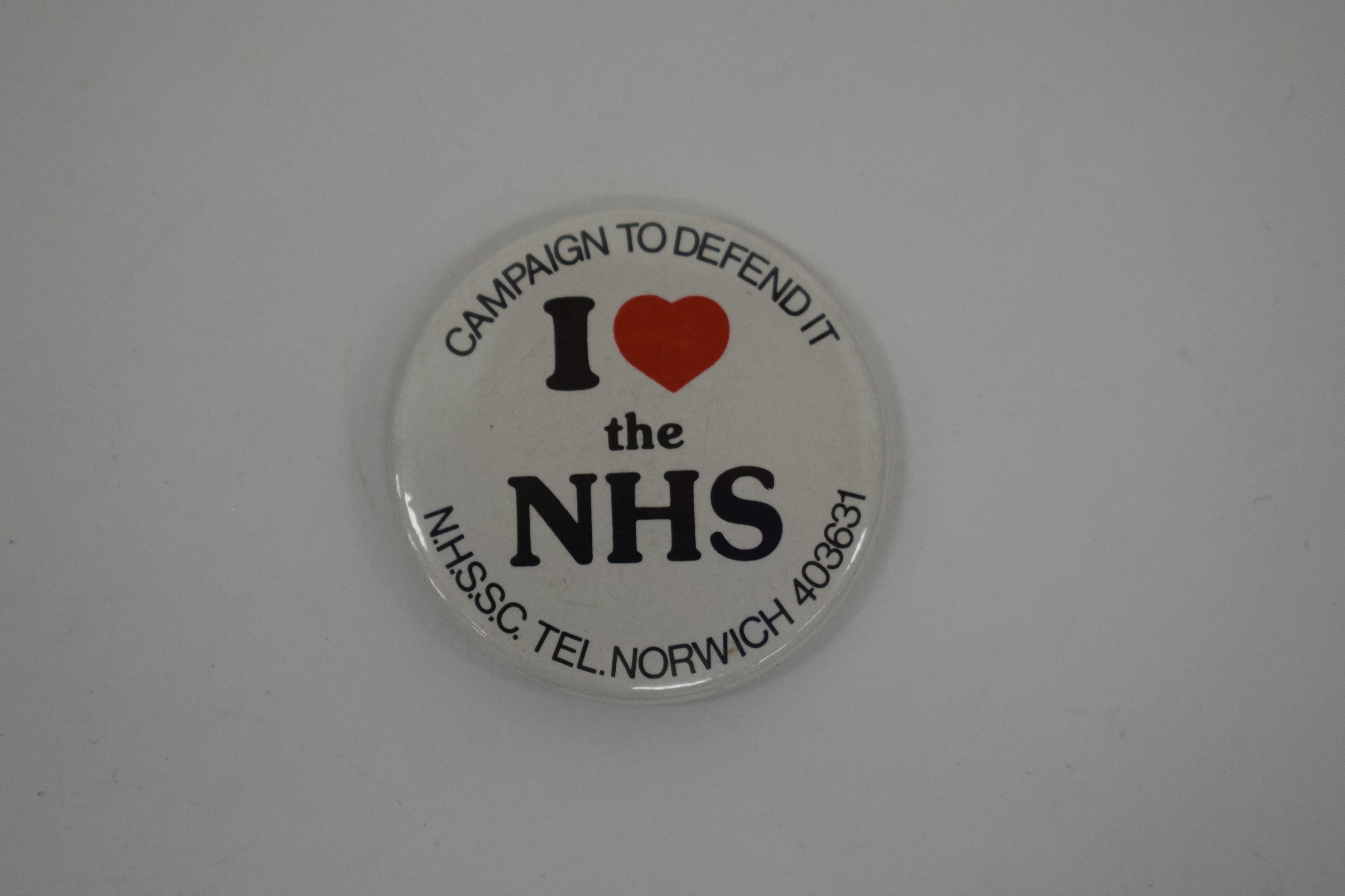 Round white badge, "I [heart] the NHS" in the centre with a red heart. Around the edge in black is "Campaign to Defend It - NHSCC Tel. Norwich 403631".
