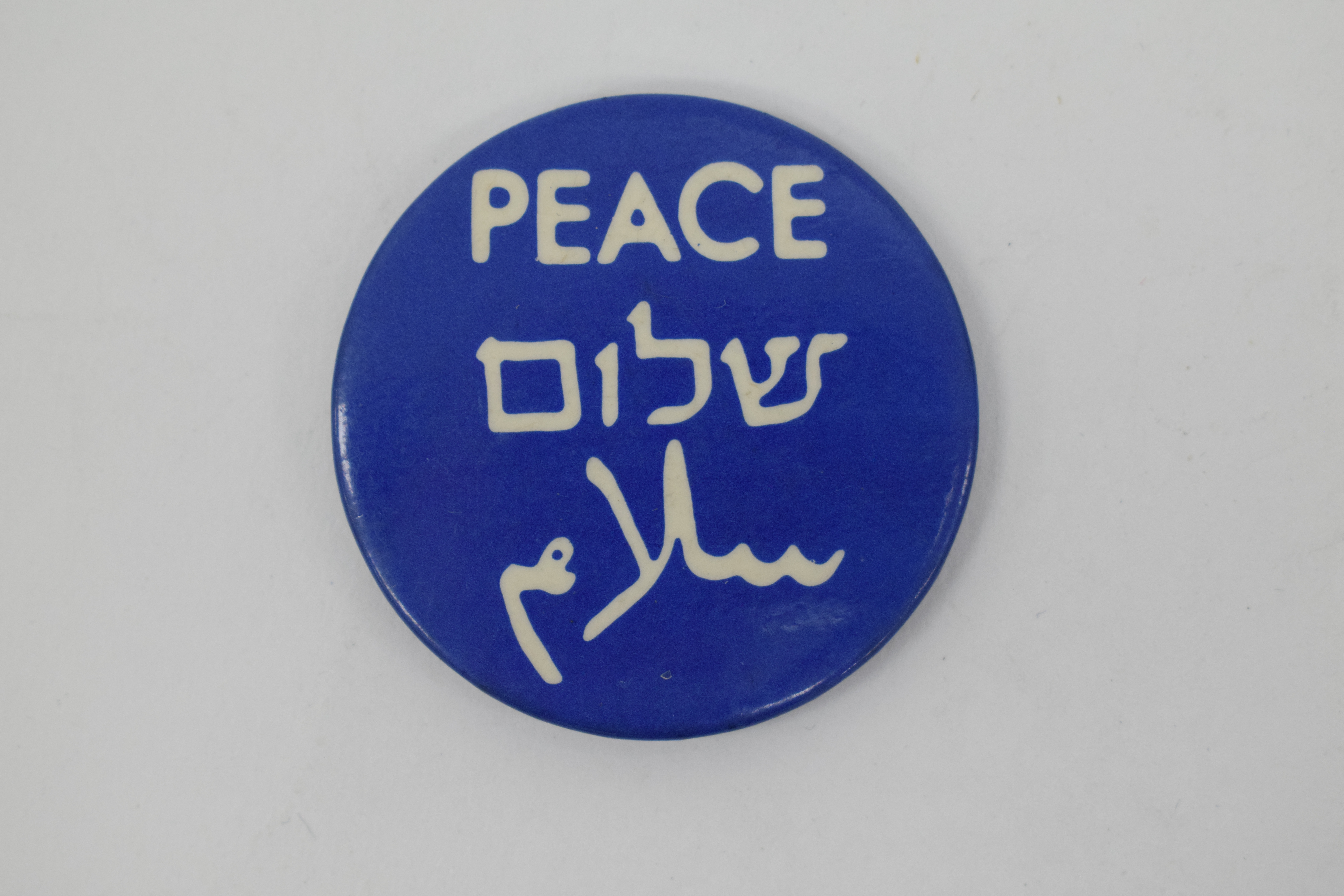 Round bright blue badge, "Peace" in white as well as two words in Hebrew.