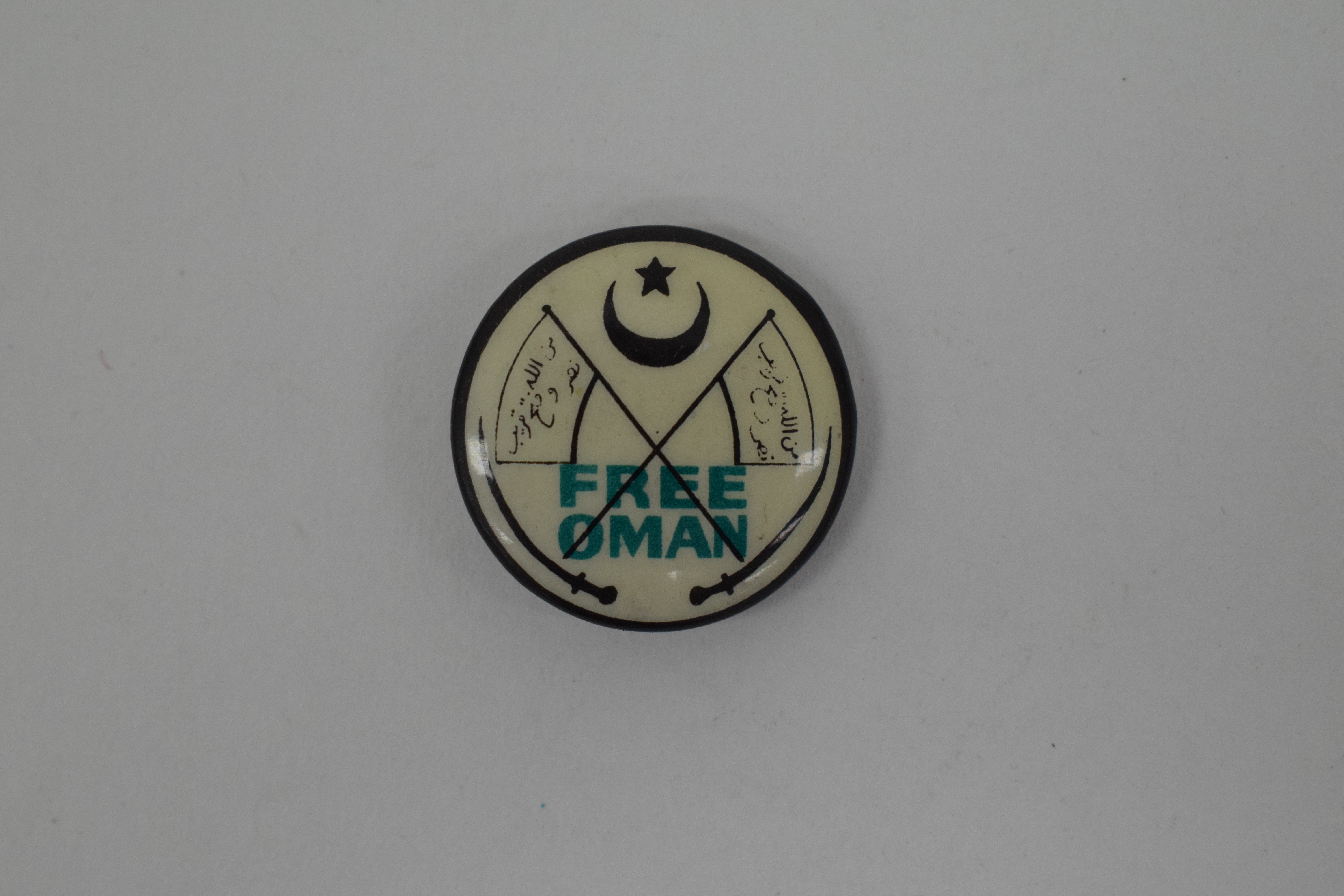 Round cream badge, "Free Oman" in blue text at the bottom. There is a thin black border. Inside is an illustration of two flags on poles that cross in a 'X' in the centre. The flags appear to have Arabic text on. At the top is a crescent moon on its side with five-pointed star above. Curving around the bottom edge sides are symmetrical swords.