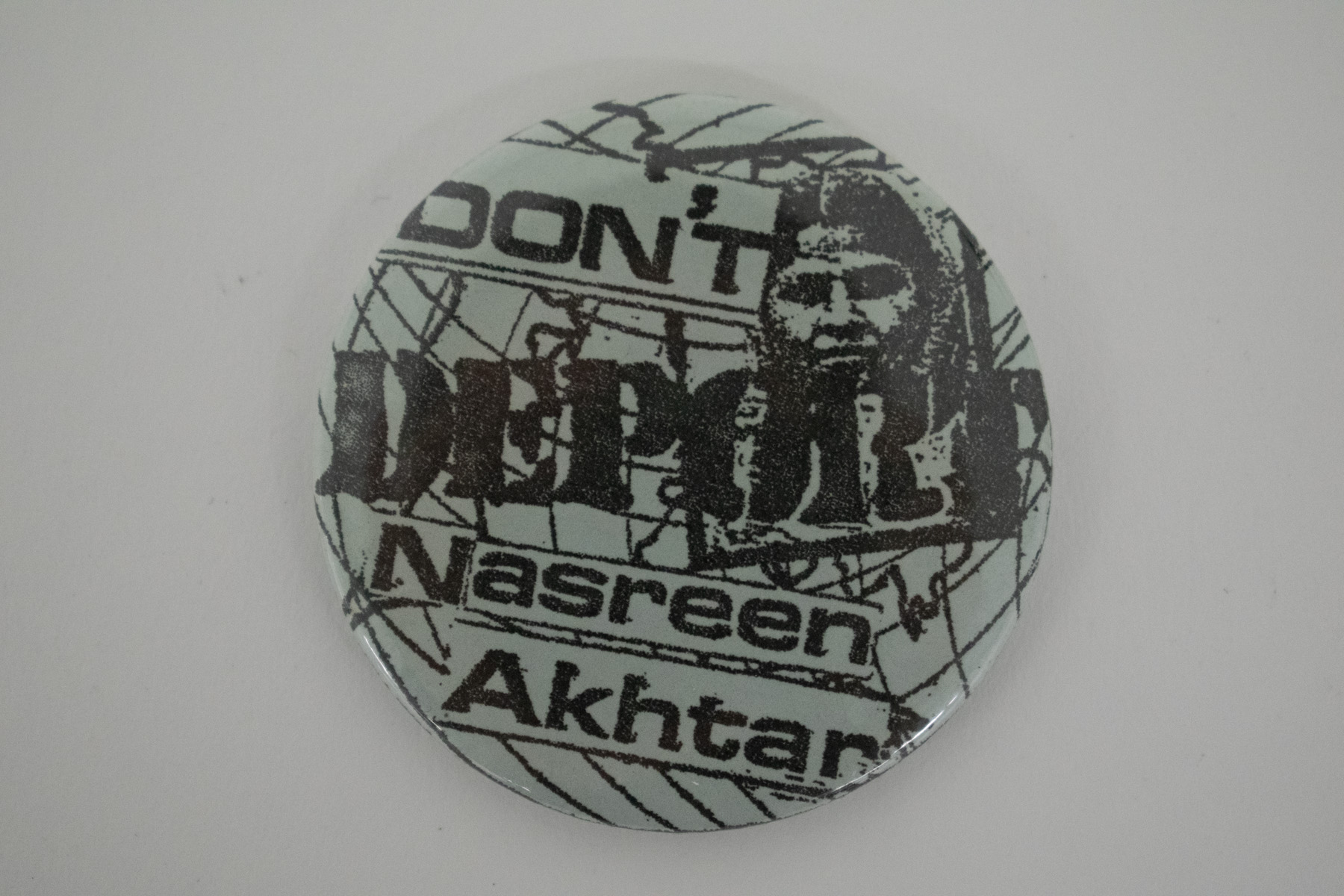 "Don't Deport Nasreen Akhtar badge" [NMLH.2001.8.1.66]