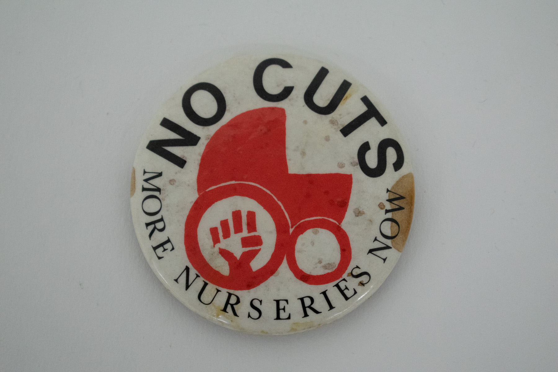 "No Cuts More Nurseries Now badge" [NMLH.2001.8.1.67]