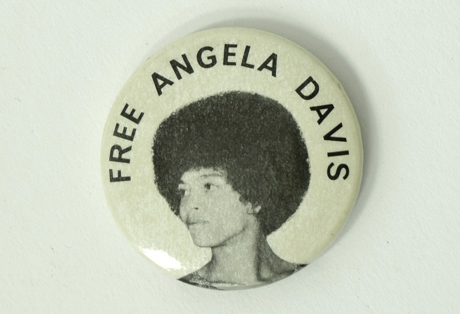Round white badge, "Free Angela Davis" in black around the top edge. In the centre is a black and white photograph of Angela Davis.