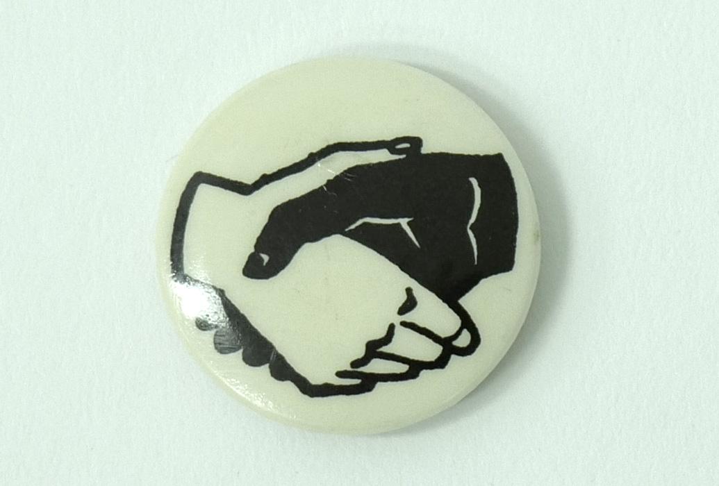 Extra small, white badge with a silhouette of two hands shaking, one black and one white.