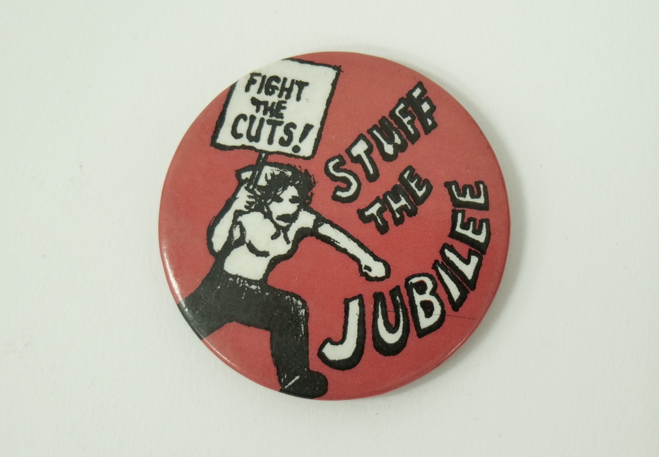 Red circular badge, "Stuff the Jubilee", beside a drawing of a person with a placard reading "Fight the Cuts!" The badge was protesting against the spending on the Jubilee of Queen Elizabeth II.