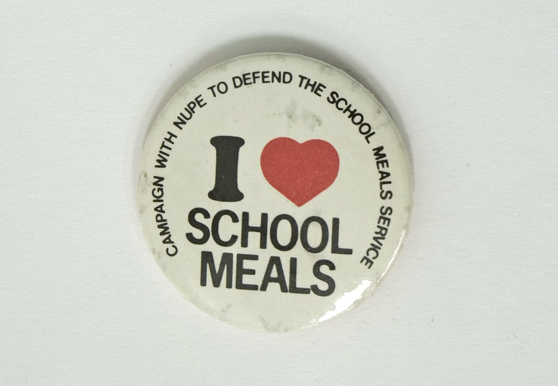 Round white badge, "I [heart] school meals" in the centre with a large red heart shape. Around the top edge in black is "Campaign with NUPE to defend the school meals service". NUPE refers to the National Union of Public Employees.
