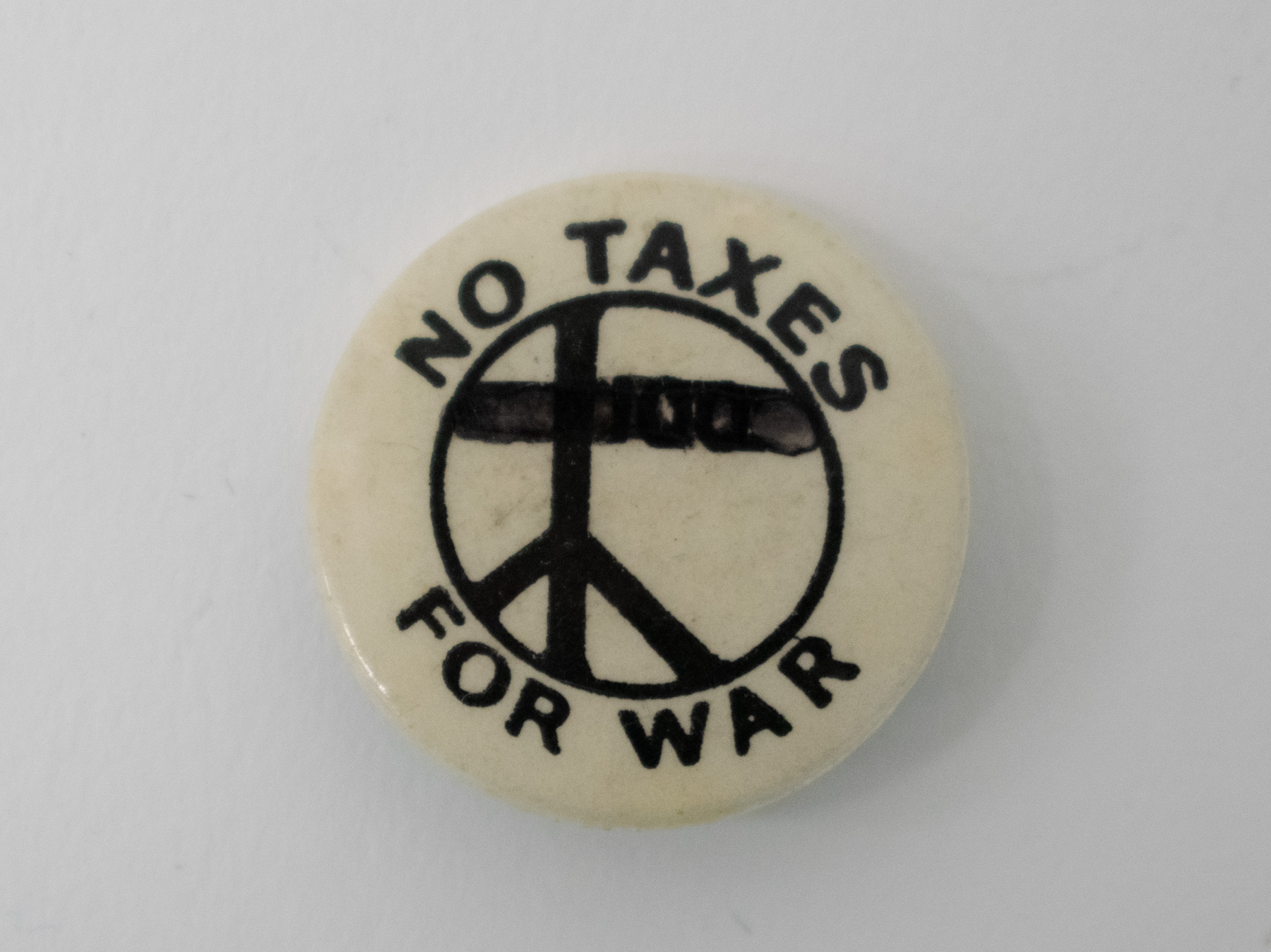 Round cream badge, "No Taxes For War" around the edge. In the centre is an-offcentre peace symbol, the logo of Campaign for Nuclear Disarmament (CND).