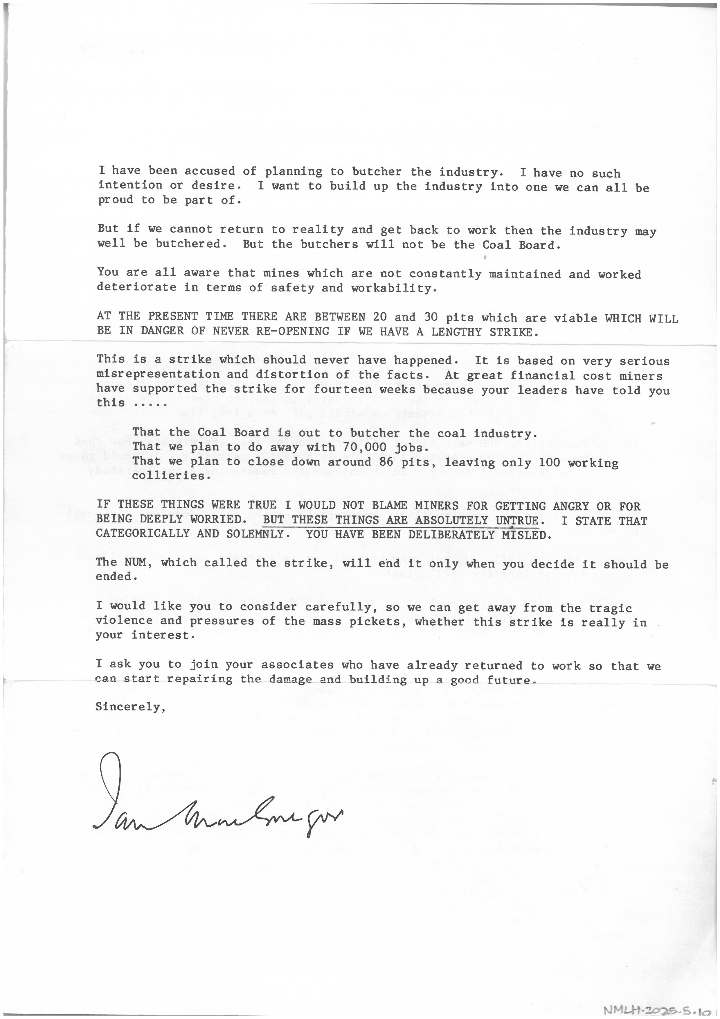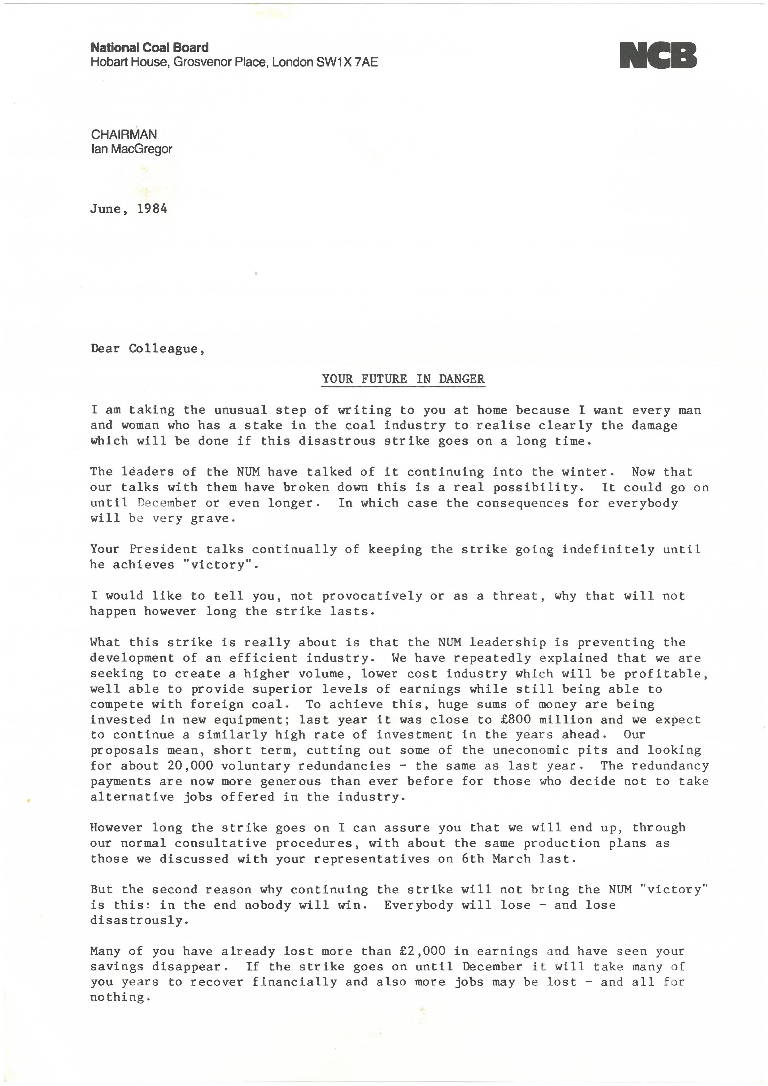 "Letter from National Coal Board Chairman June 1984" [NMLH.2025.5.10]