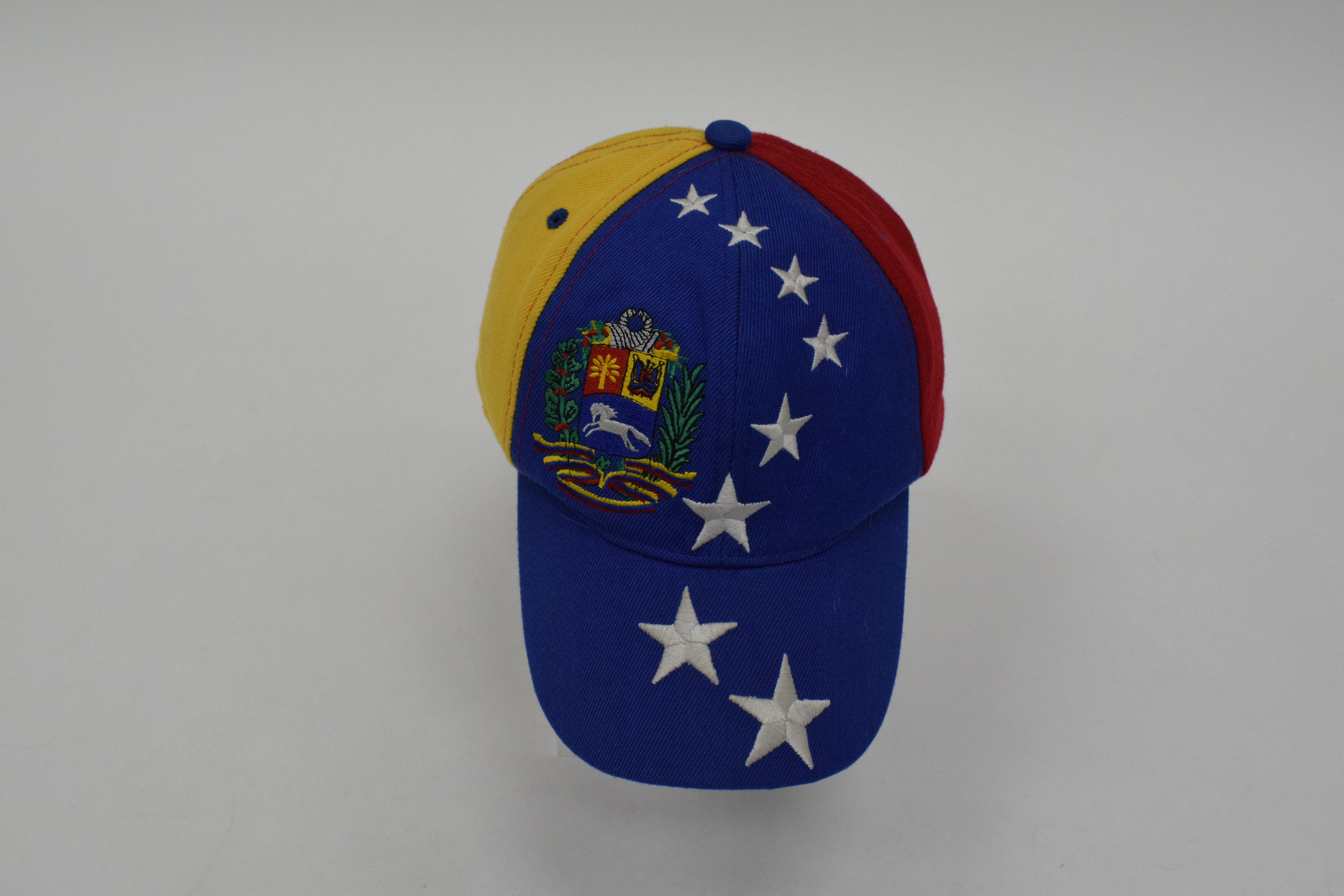 A baseball cap in the colours of the Venezuelan flag. The reverse has white text saying 'Venezuela'.
