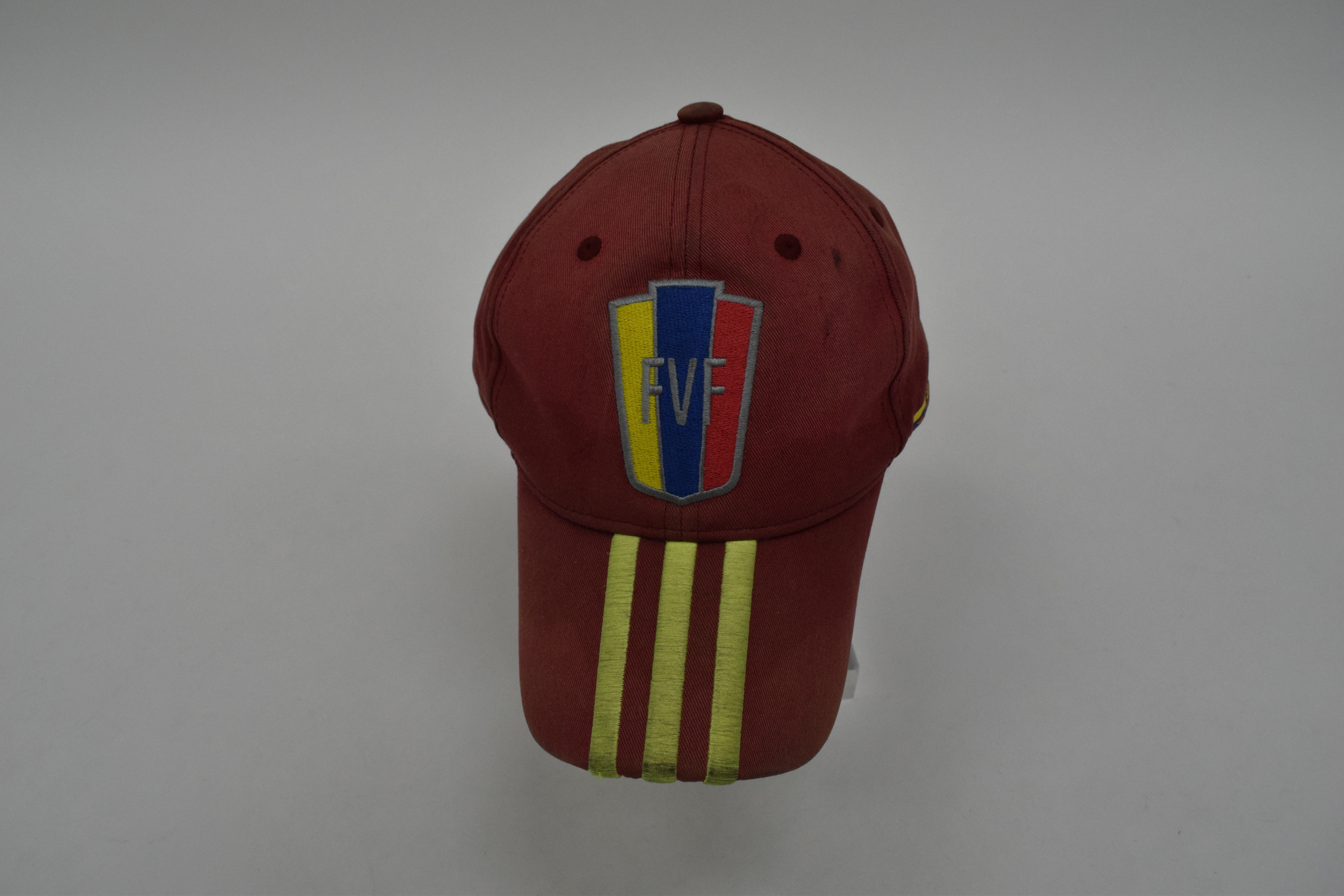 A dark red baseball cap with the logo of the Venezuelan Football Federation (FVF) in the colours of the Venezuelan flag.