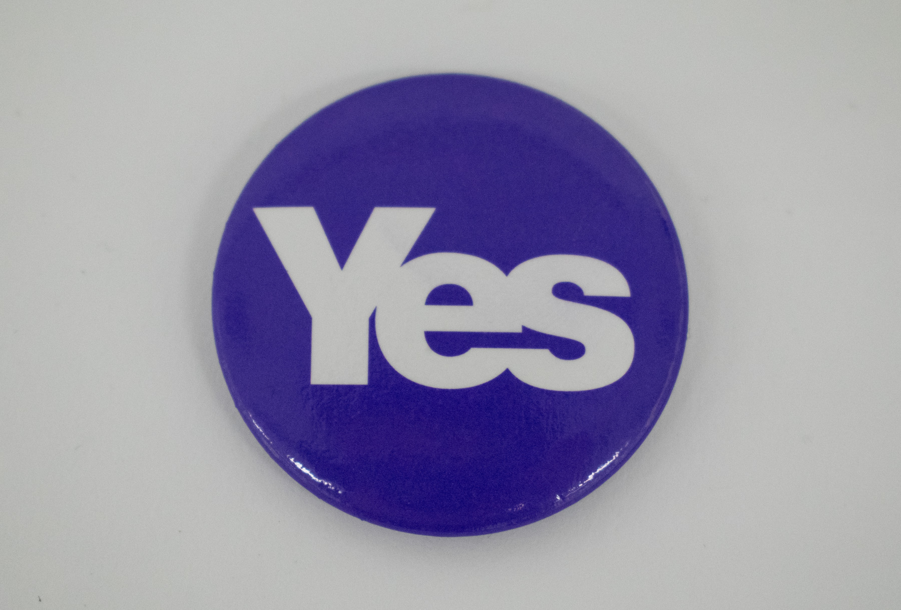Round dark blue badge, "Yes" in bold white text, which was made for the 2014 Scottish referendum on independence.