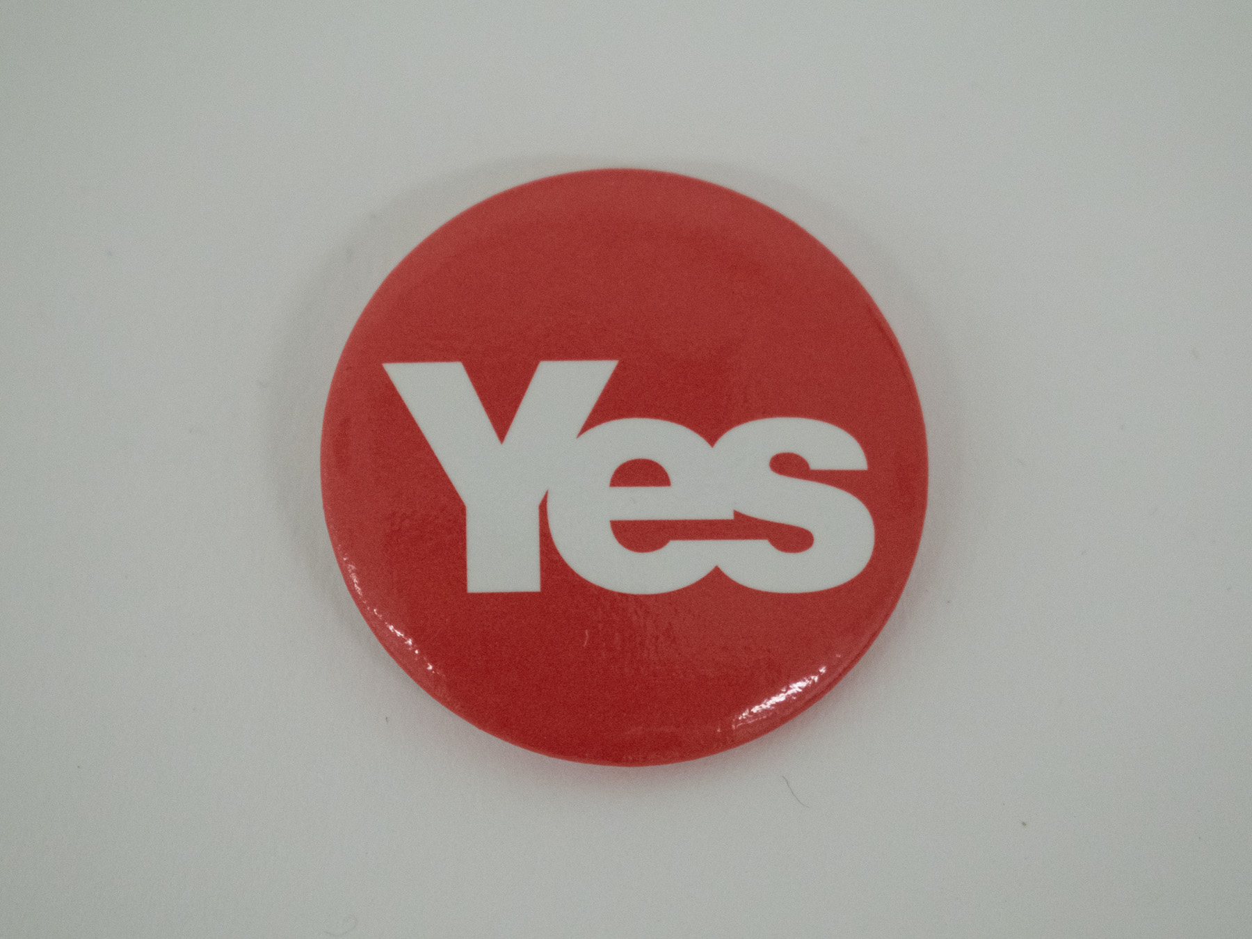 Round red badge, "Yes" in bold white text, which was made for the 2014 Scottish referendum on independence.