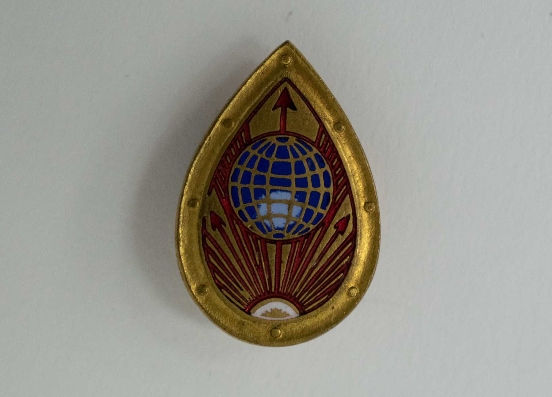 Teardrop-shaped metal badge featuring a blue globe in the centre with red pointed arrows pointing upwards, with a gold border.