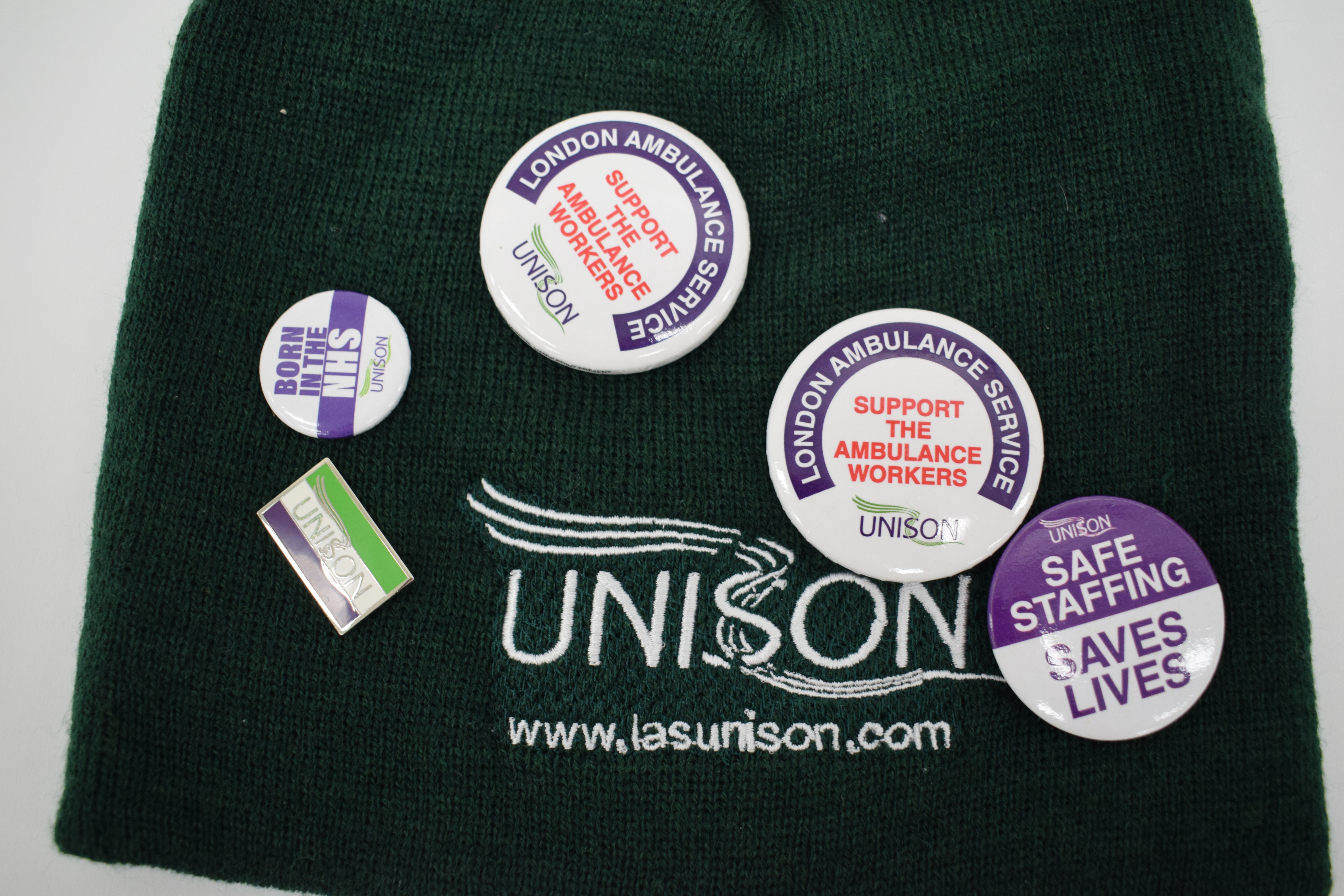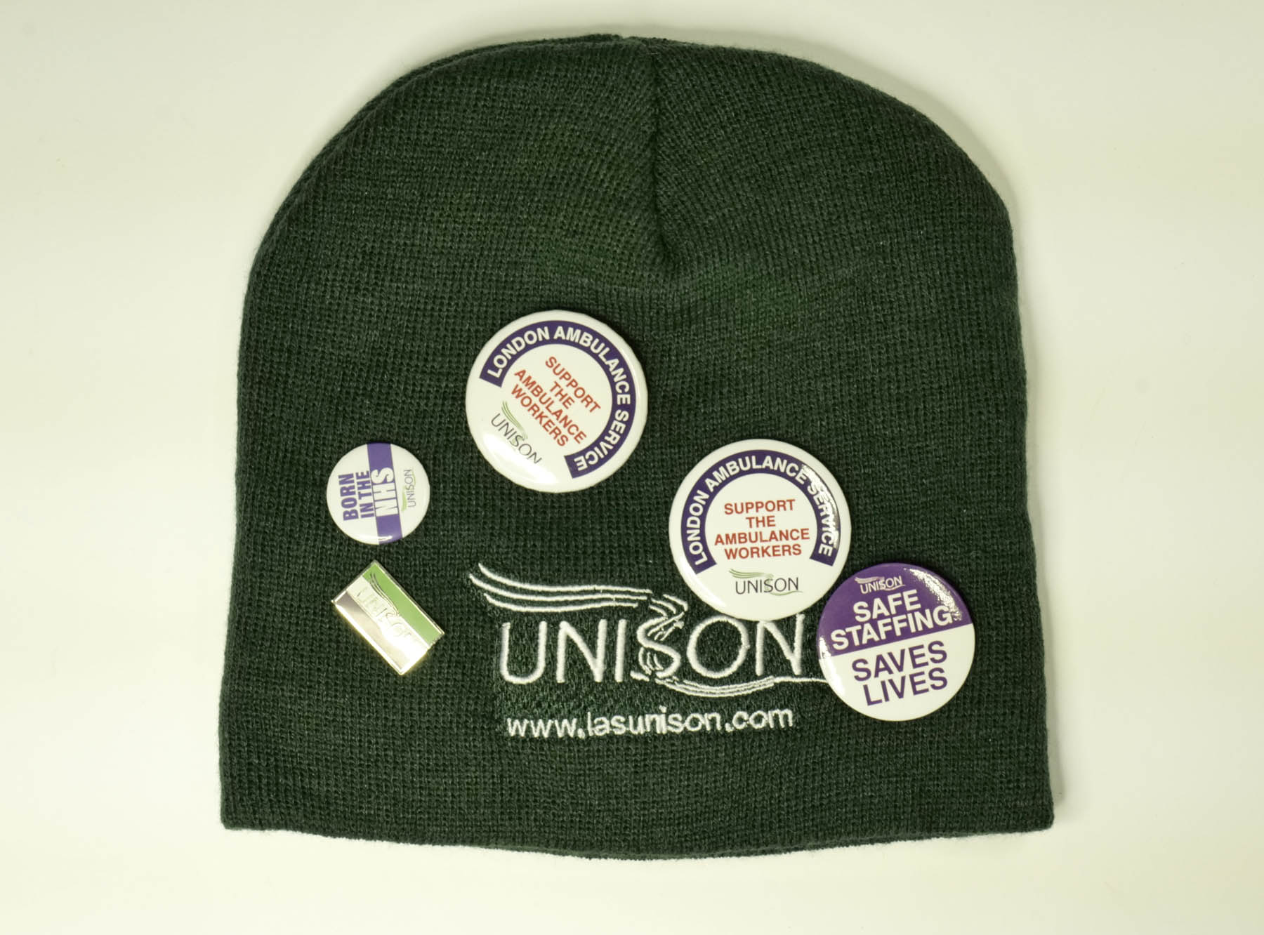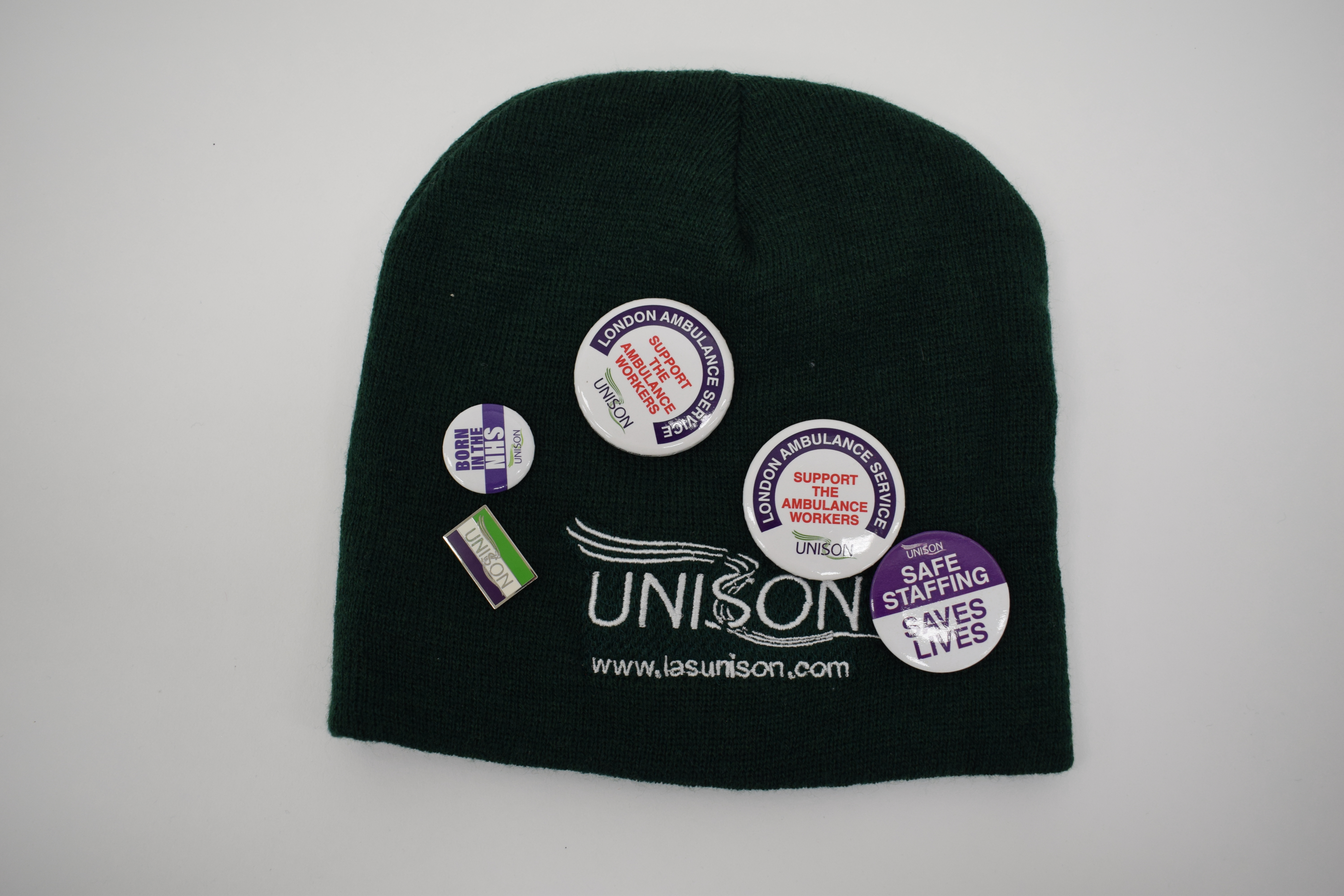 A green hat with the UNISON logo embroidered in white. 5 UNISON badges are attached to the hat with messages including 'London Ambulance Service. Support the ambulance workers', 'Born in the NHS' and 'Safe staffing saves lives'.