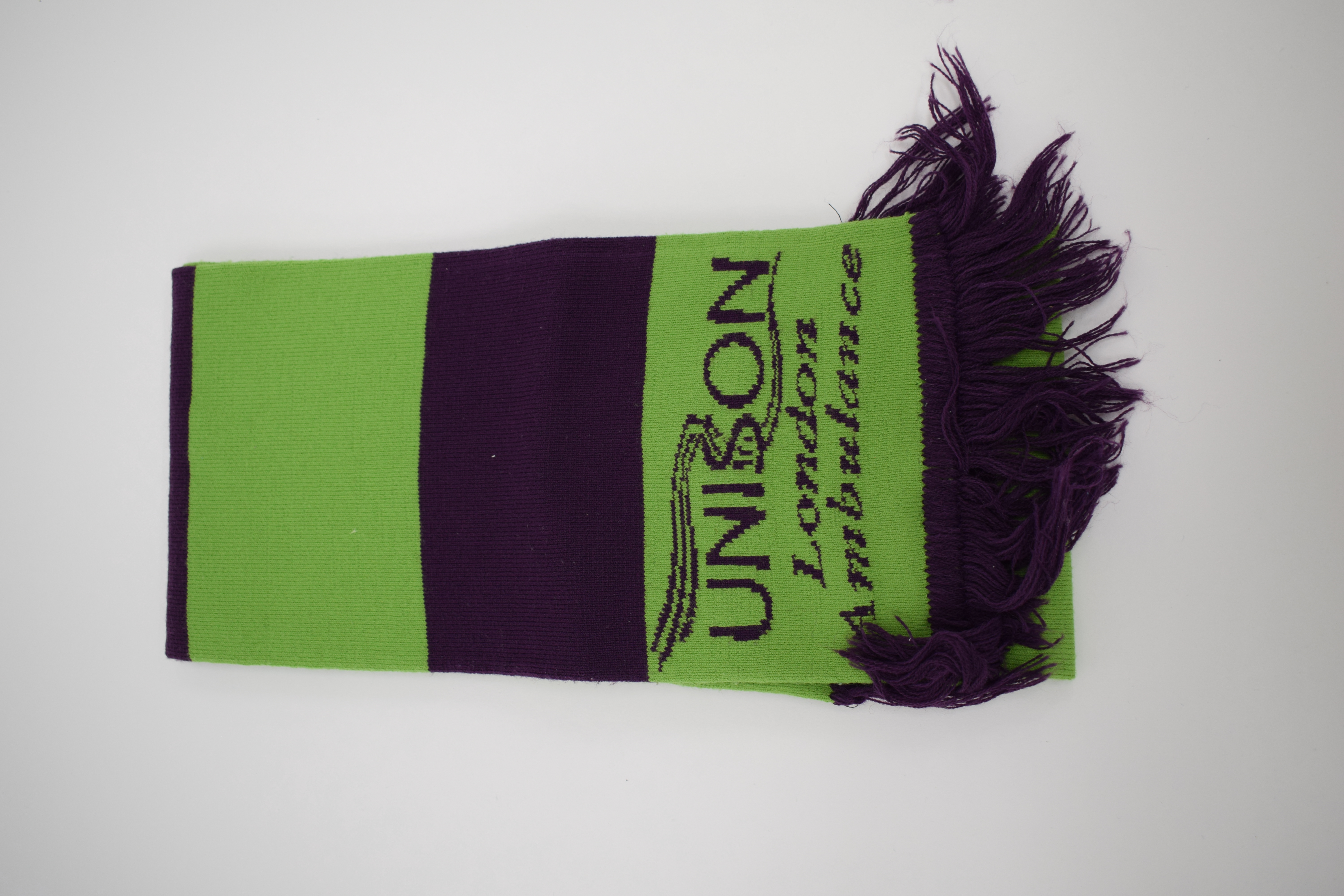 A green and purple striped scarf with the UNISON logo embroidered in purple.