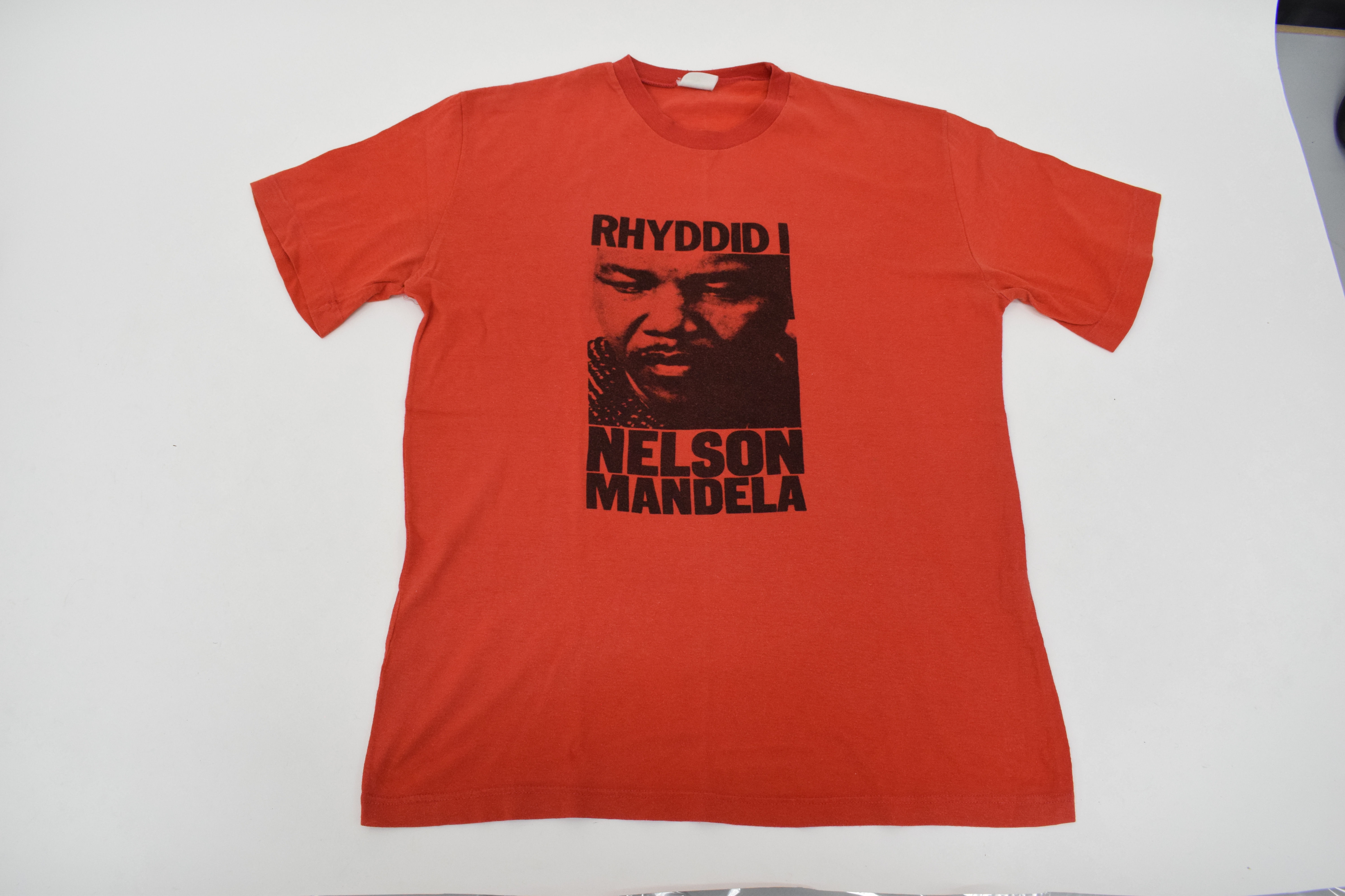A red t-shirt featuring a black portrait of Nelson Mandela with the Welsh language caption 'Rhyddid i Nelson Mandela'.