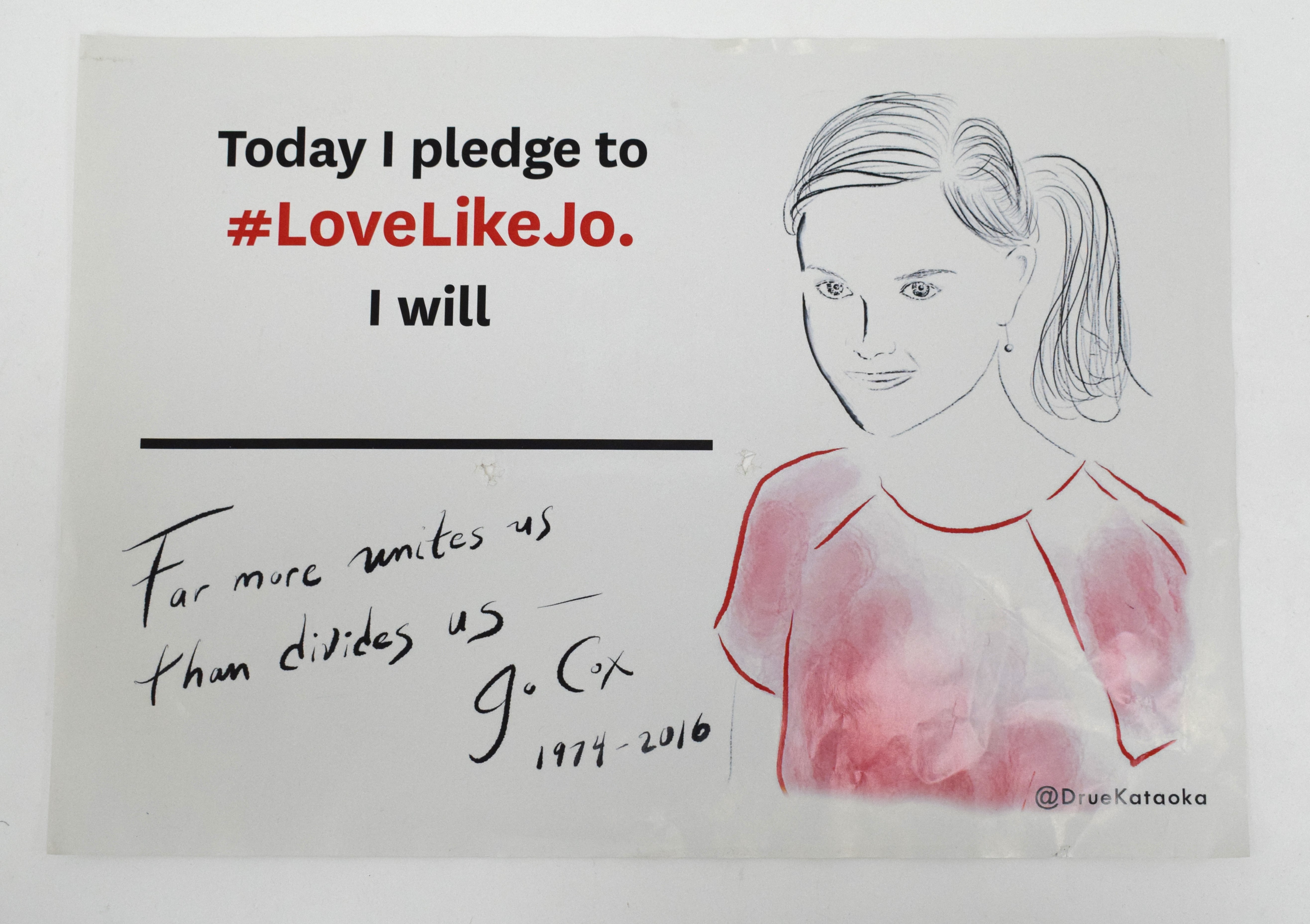 A white placard with a line drawing of Jo Cox wearing a red t-shirt. Text reads 'Today I pledge to #LoveLikeJo. I will [blank]' with a printed message in Jo Cox's handwriting beneath the blank line. 'Far more unites us than divides us - Jo Cox 1974-2016'