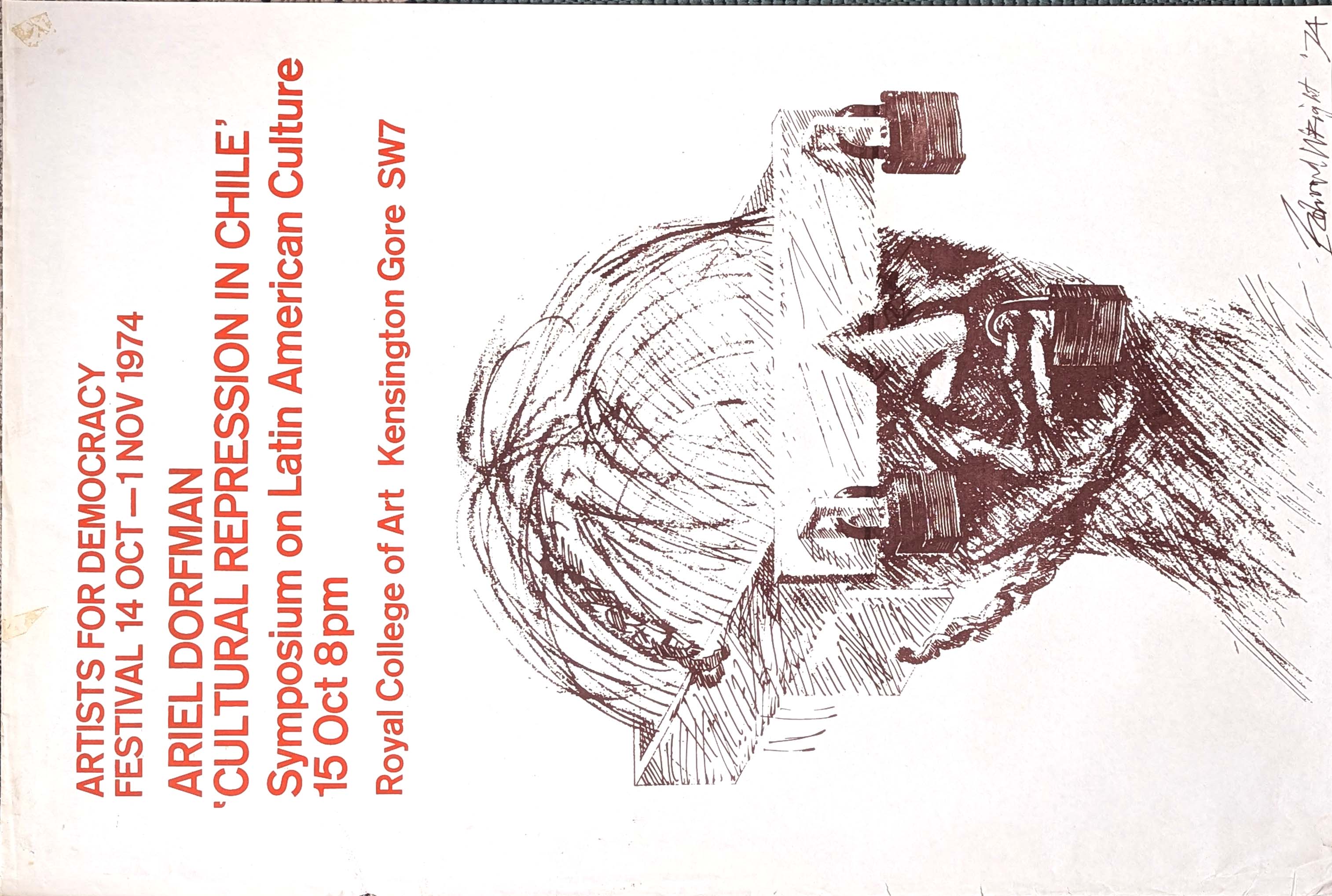 Screenprinted poster, in red on a white background, "Artists for Democracy Festival 14 Oct - 1 Nov 1974. Ariel Dorfman 'Cultural Repression in Chile' - Symposium on Latin American Culture 15 Oct 8pm - Royal College of Art Kensington Gore SW7". Below is a drawing of a person's head with a box covering just their eyes, with a padlock either side where their eyes should be. Another padlock clamps their lips shut, and the box strucutre is held on by a chain around the head.