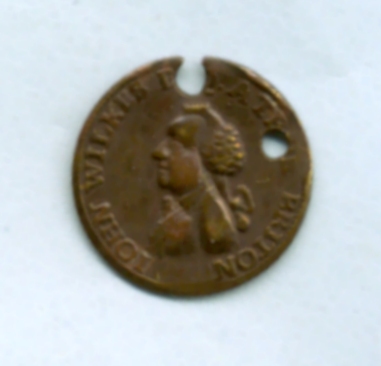 A commemorative medal or token featuring a portrait of John Wilkes (17 October 1725 â 26 December 1797). Wilkes was a member of parliament for Middlesex, and a radical journalist who edited the anti-government newspaper The North Briton.