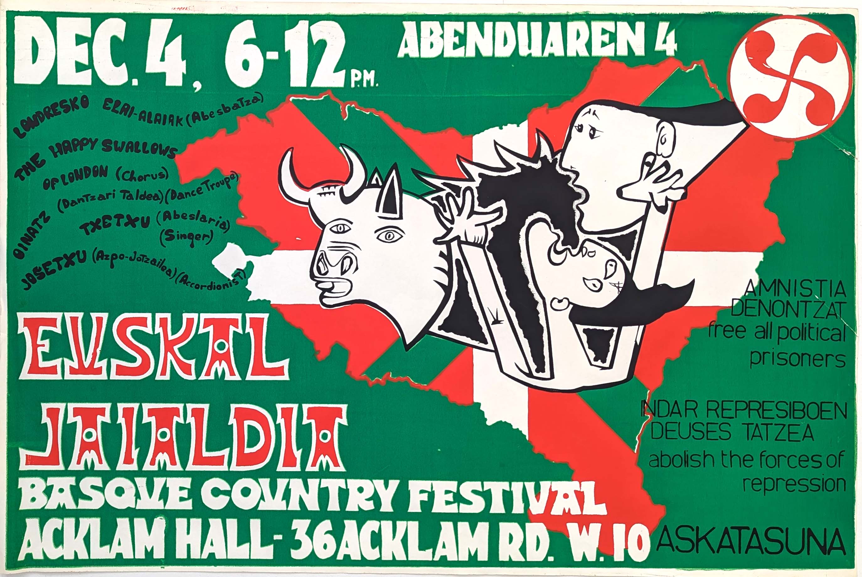 Screenprinted poster, "Basque Country Festival, Acklam Hall, 36 Acklam Rd, W10" in white text. Black text on the right in Basque and English reads "free all political prisoners" and "abolish the forces of repression". The largest text is "evskal jaialdia" ["Basque festival" in Basque] in red with a white outline. Above the text is a cartoon illustration of the heads of a bull and two people, one with armed raised. They are on a background of the Basque flag, which has a red background, a white cross, and a green diagonal cross.