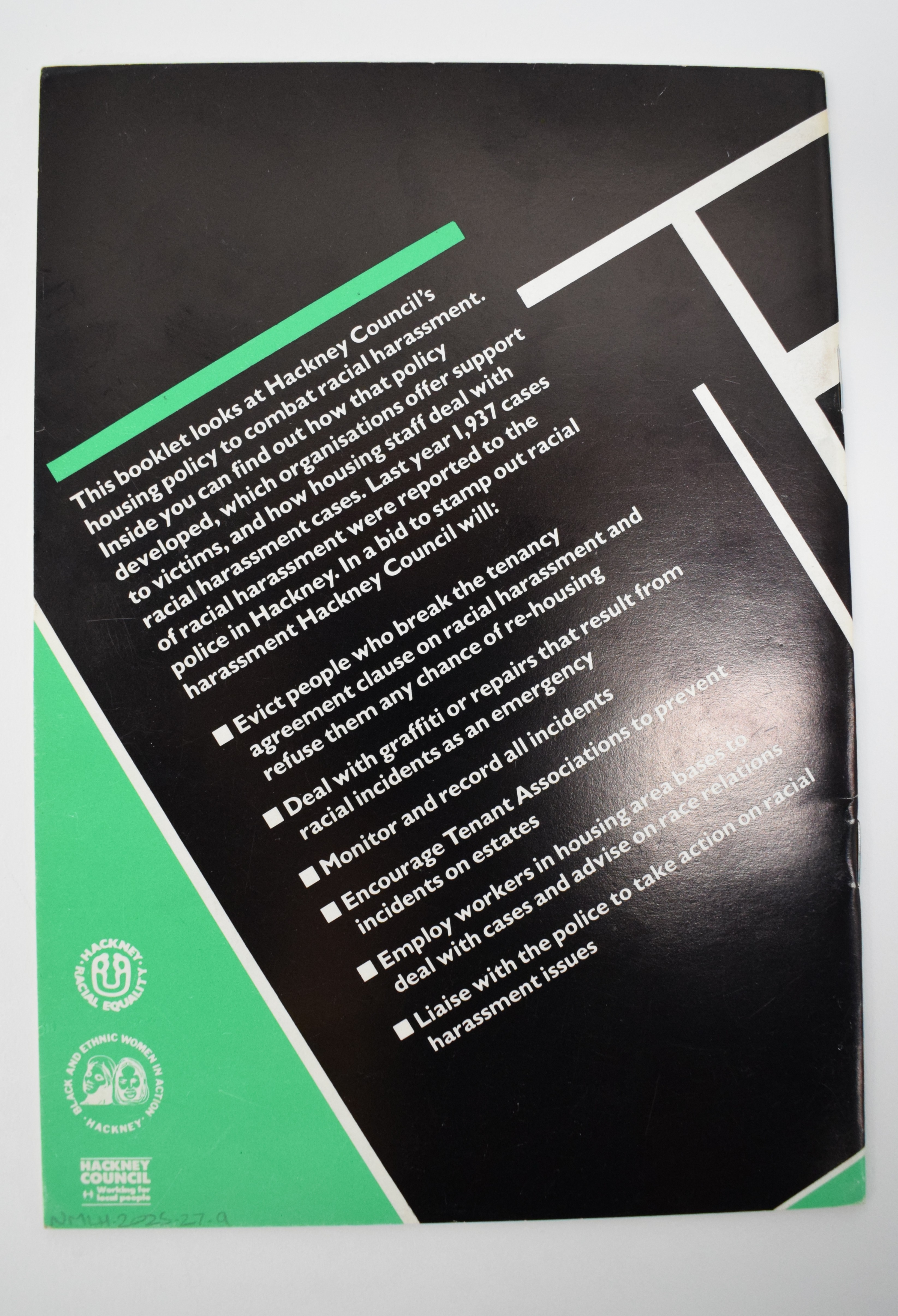 Booklet, 'Racial Harassment Let's Stop It Now', published by Hackney Council. The booklet looks at the council's housing policy and how that is working to combat racial harassment.