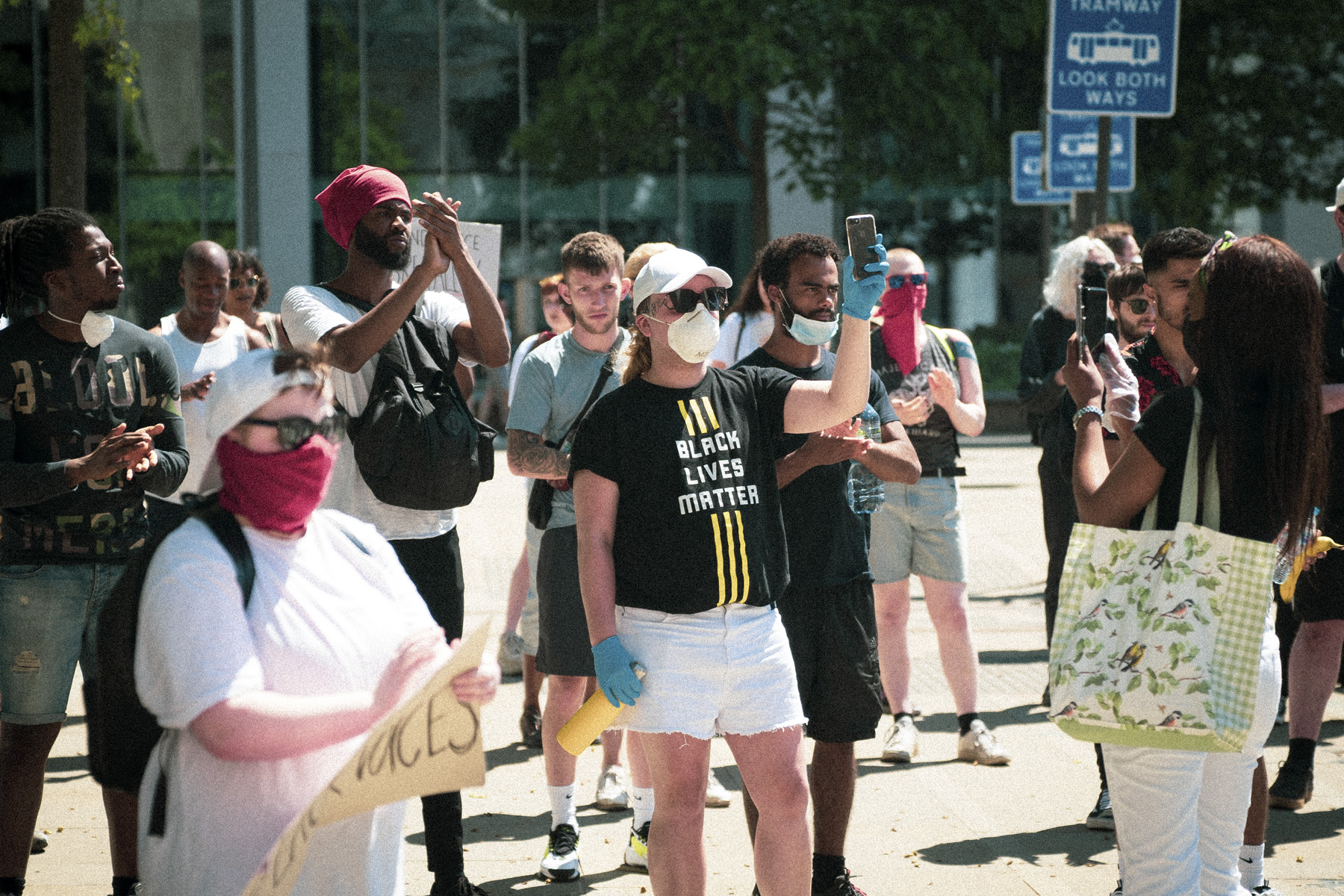 Digital colour photograph of a small crowd of around 12 people standing outside in a square with buildings and trees blurred in the background. The photographer has focused on a tall person in the centre with dark brown skin, black beard, and red hair wrap, who is raising their hands clapping. To the right is a person with light fair skin wearing a "Black Lives Matter" black t-shirt, white filter mask, and white cap. They hold up their phone. The crowd is racially diverse and appears sombre. Several people wear face coverings over their mouths and noses.