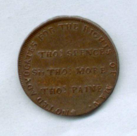 Produced in the 1790s this medal features Thomas Spence, a radical bookseller. Spence had a group named after him called The Society of Spencean Philanthropists.