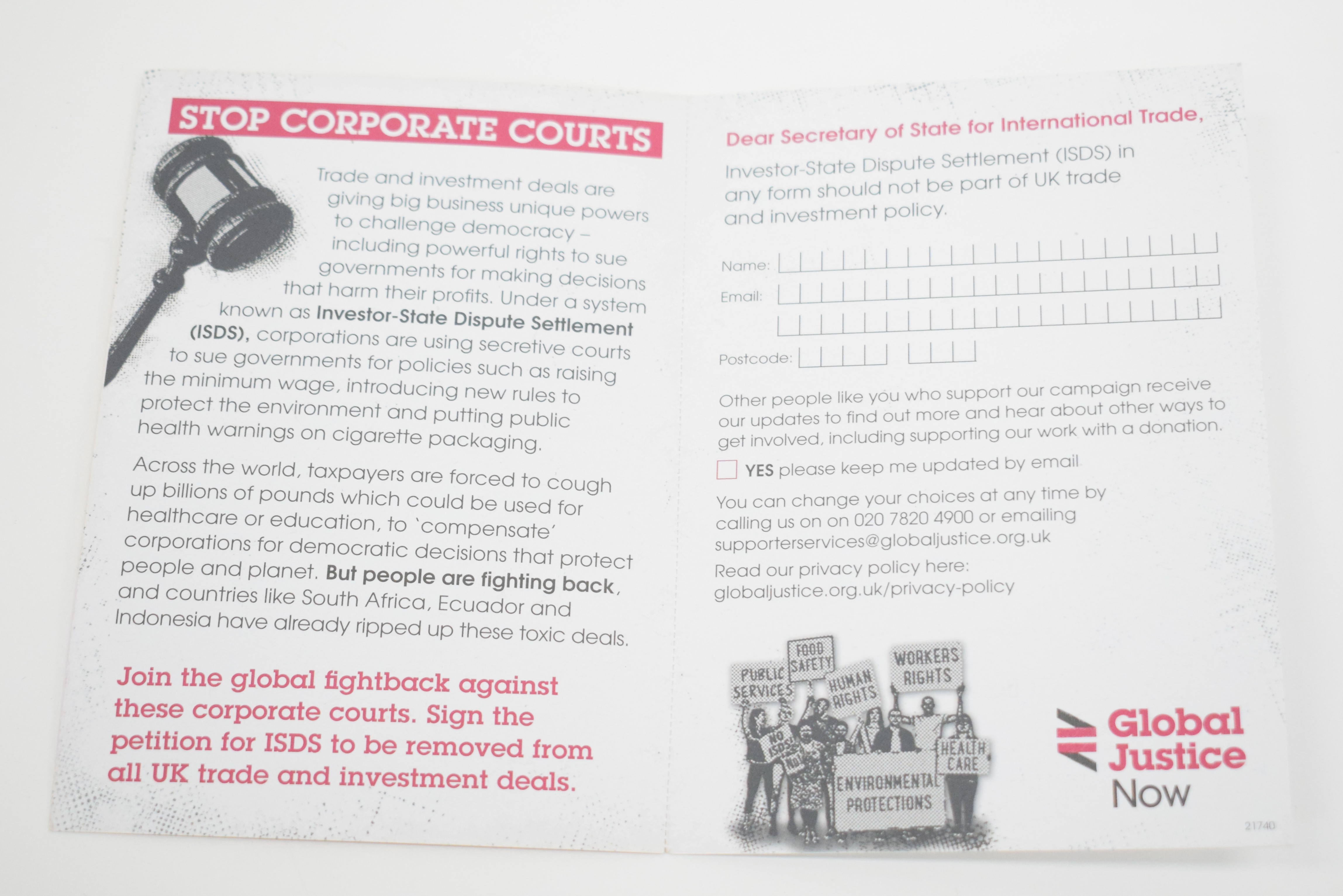Leaflet by Global Justice Now, 'Stop Corporate Courts Hammering Democracy'. The front of the leaflet shows a drawing of a judge's gavel coming down on a group of protestors holding placards reading "Human Rights" and "Environmenal Protections".