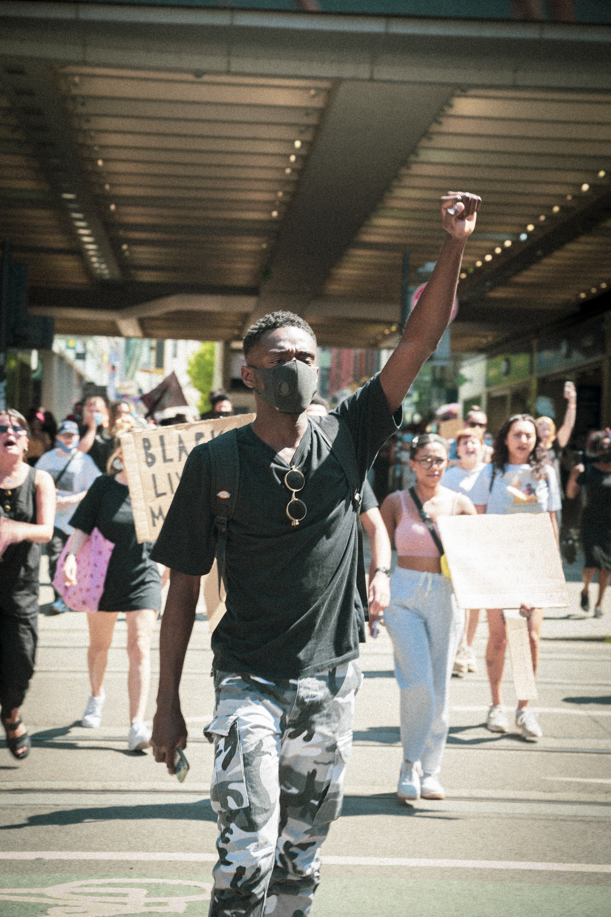Digital colour photograph of a protester at a Black Lives Matter protest in Manchester in 2020. The protester, walking at the front of a group, has dark brown skin and short tightly curly black hair, shaved on the sides. They are wearing a dark grey face mask over mouth and nose, a black t-shirt, white and grey trousers, and a black backpack. They hold their left arm up in the air in a raised fist. In the background are other people walking in the same direction, blurred by the camera.