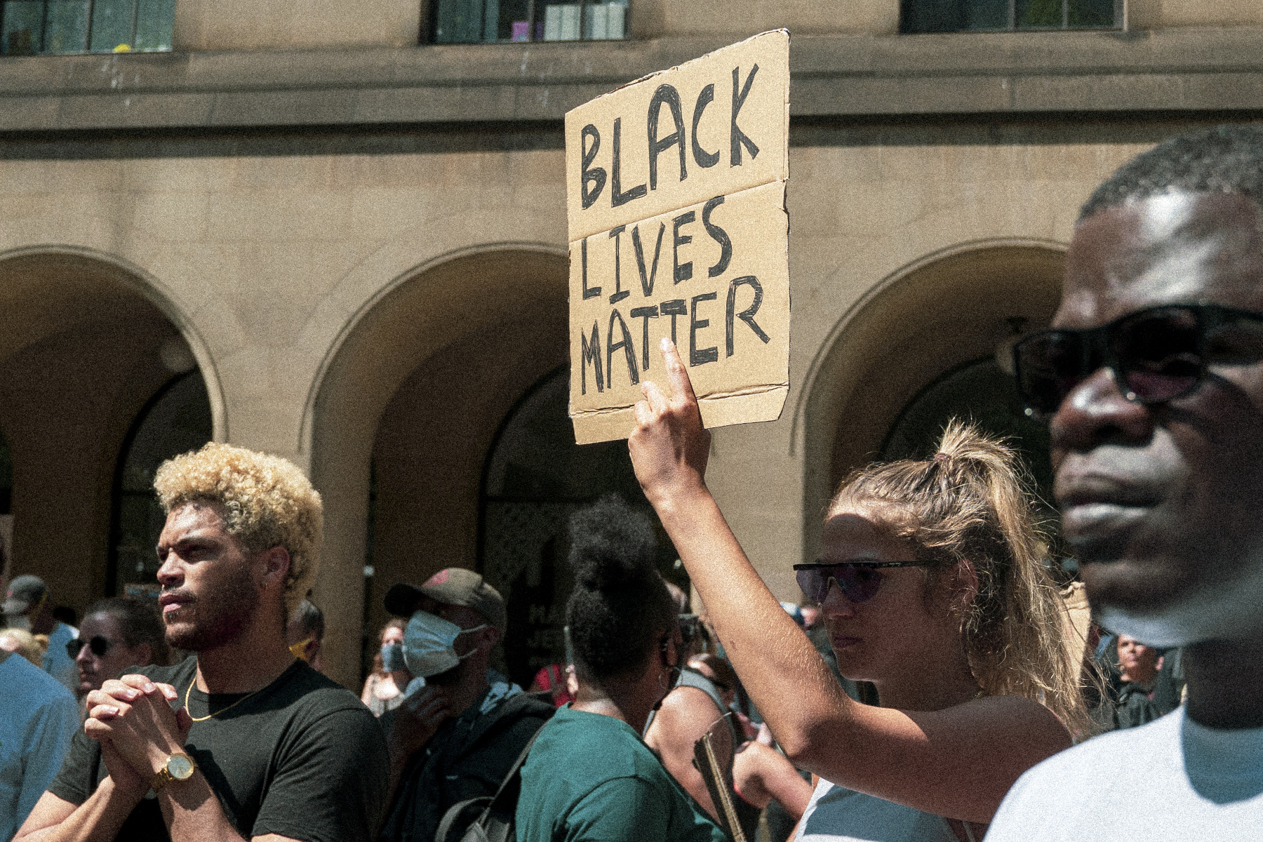 Digital colour photograph of a protester holding up a cardboard placard reading "Black Lives Matter". They have light tanned skin, long straight blonde hair tied up in a ponytail, and are wearing sunglasses. To the left is a person with brown skin and bleached blonde tight curly hair in a short afro wearing a black t-shirt. To the right in the foreground is a person with dark brown skin and very short black hair, wearing black sunglasses and white t-shirt.