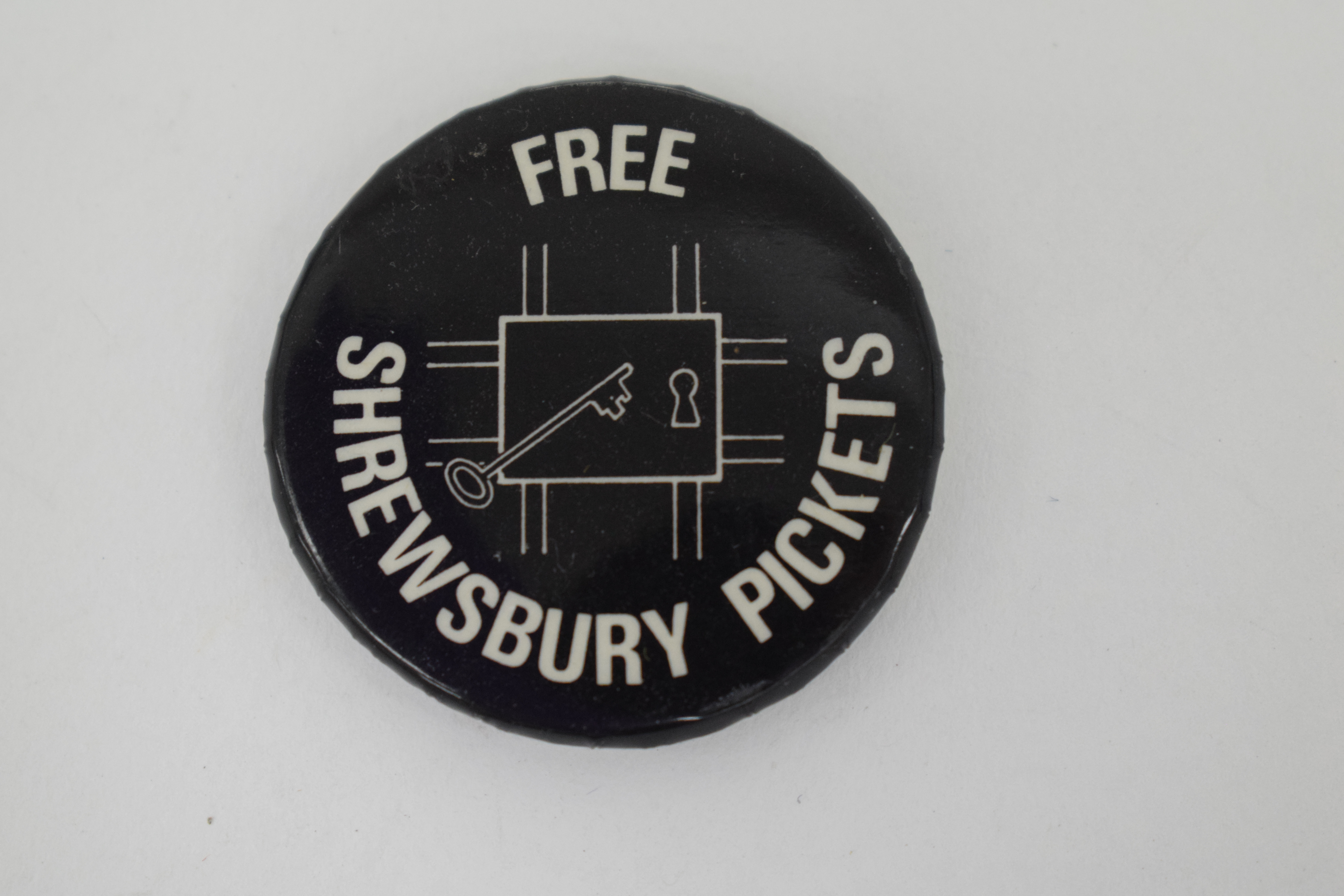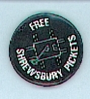 Round black badge, "FREE SHREWSBURY PICKETS" with an image of a key and lock in the centre.