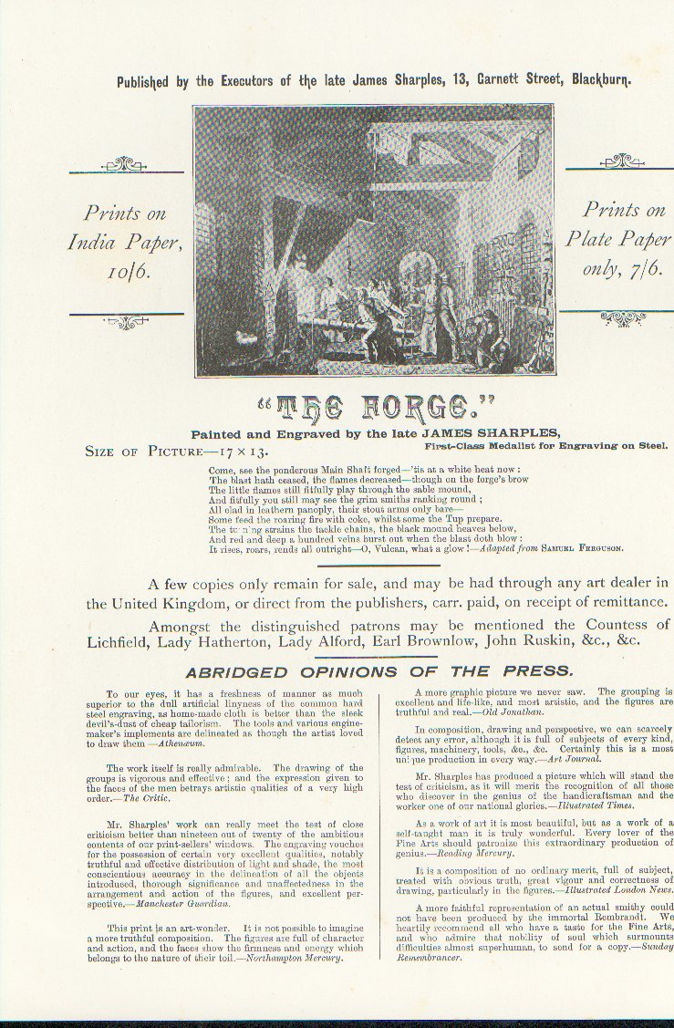PUBLISHED BY THE EXECUTORS OF THE LATE JAMES SHARPLES .. BLACKBURN . PRINTS ON THE INDIA PAPER 10/6.. "THE FORGE", PAINTED AND ENGRAVED BY THE LATE JAMES SHARPLES .. ...