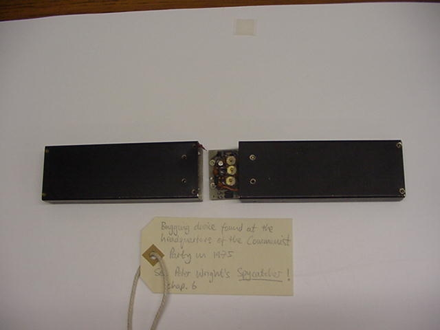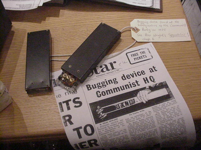 This surveillance 'bug', discovered by builders in February 1975, was probably used by MI5 to spy on Communist activity. Former MI5 officer Peter Wright may have planted it, as in his book, 'Spycatcher', he describes concealing a 'bug' at Communist Party headquarters. The government did not admit responsibility for the device.