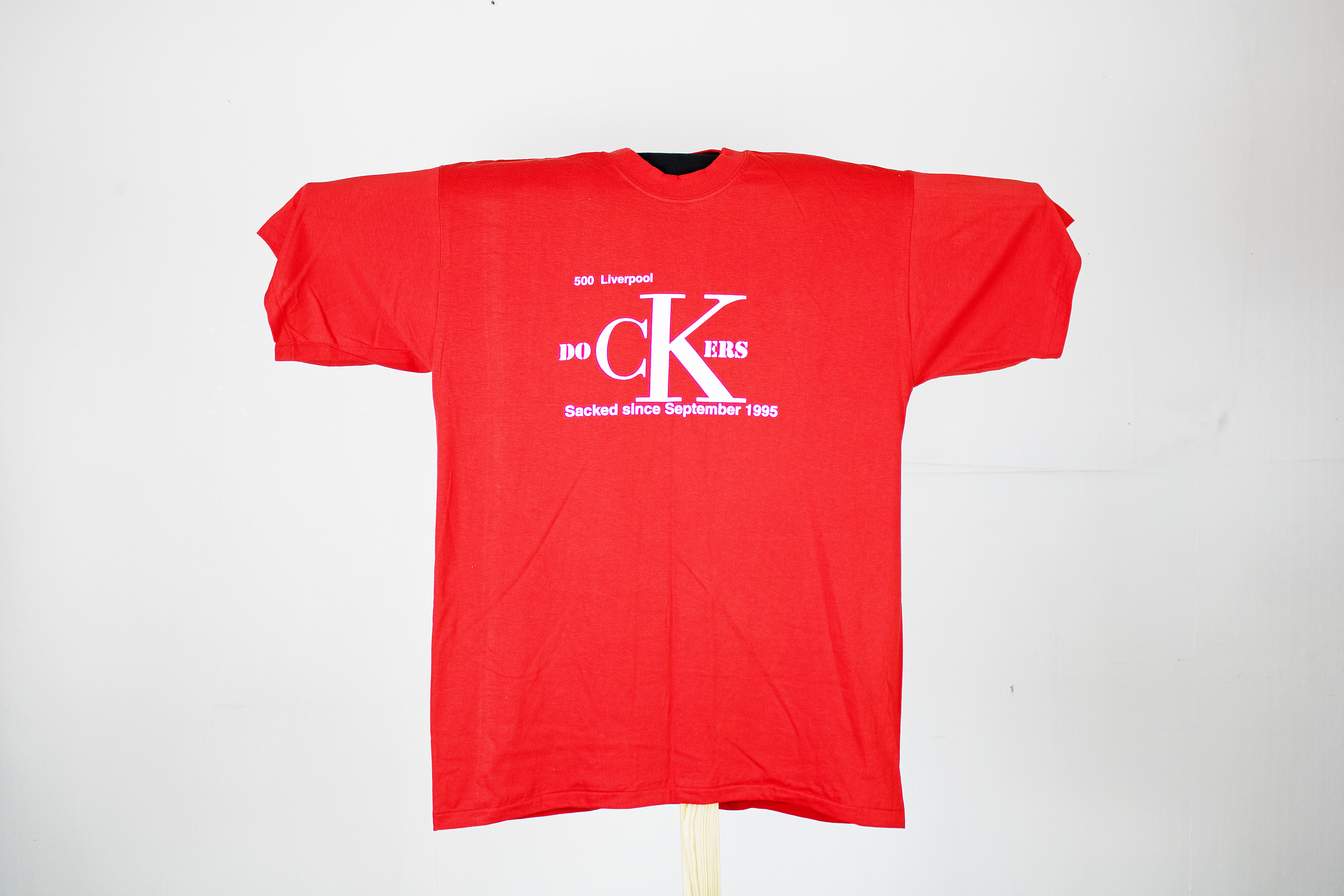 A red t-shirt with white lettering reading "500 Liverpool Dockers sacked since September 1995".