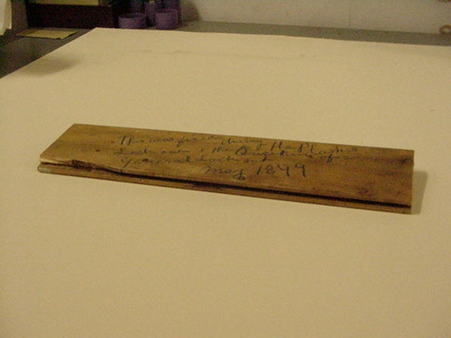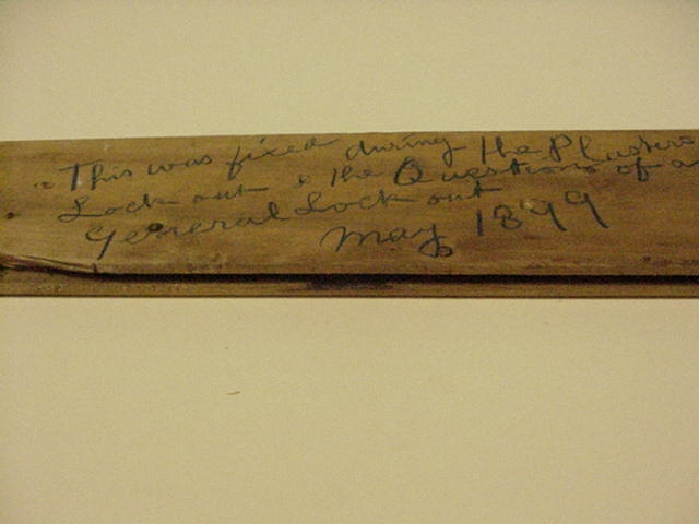 Builders found this panel in a Leeds office in 1997 while removing a partition wall. The text reads "This was fixed during the plasterers lockout and the question of a general lockout May 1899".
