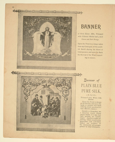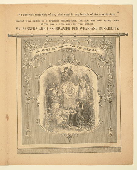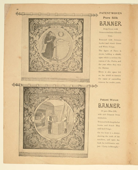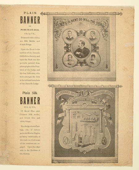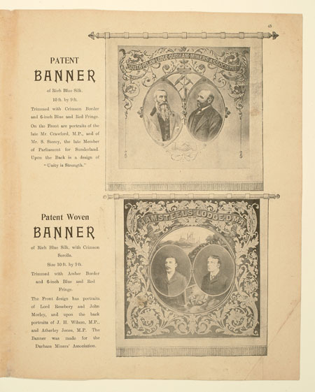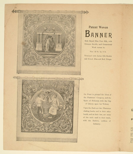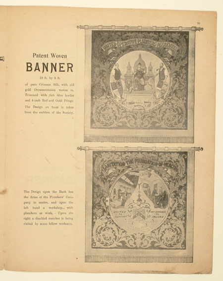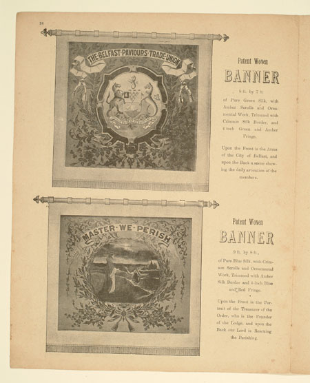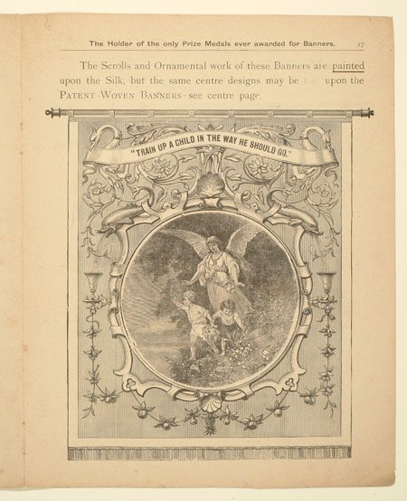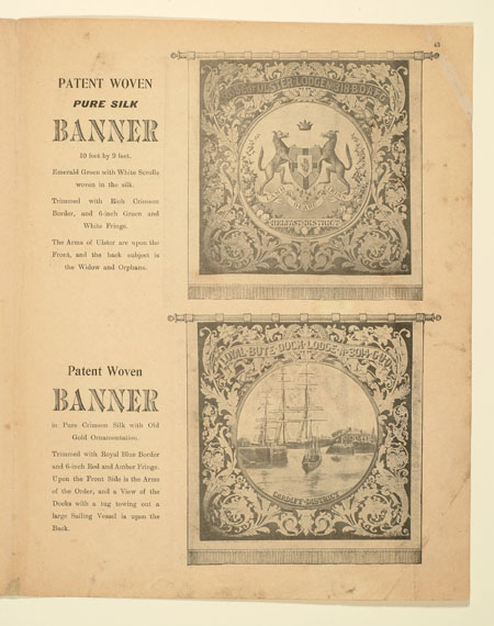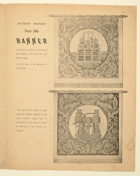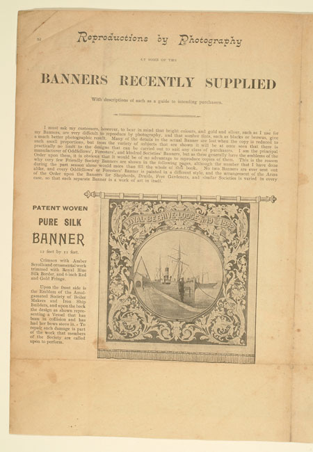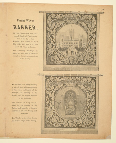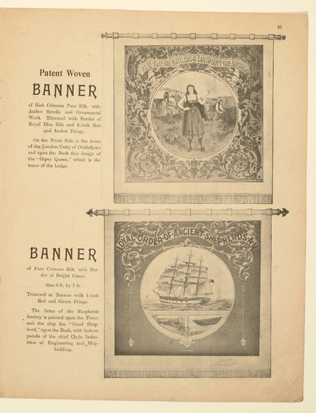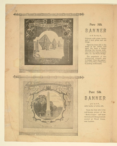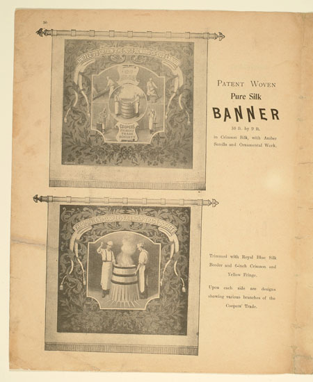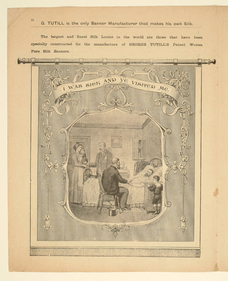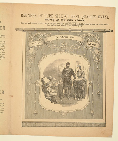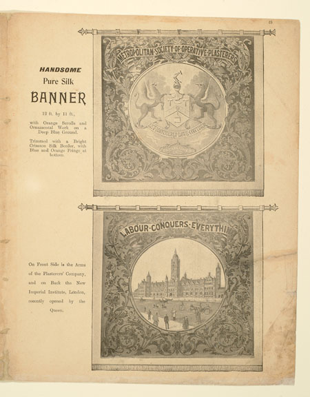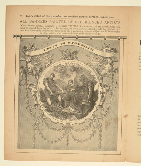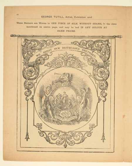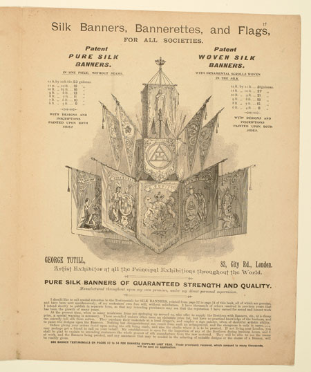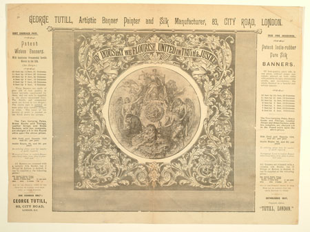 Tutill's silk banners were dyed, woven and hand painted at the company premises at 83 City Road in London. The City Road site was designed specifically for banner-making with three galleries and a glass roof to let in daylight. The painting process was highly skilled with different artists each painting landscapes, emblems, portraits and technical scenes such as buildings or workplaces. Banners made for the Ancient Order of Foresters and other friendly societies featured similar symbols representing hope, justice and the 'all seeing eye' which were common in other artworks produced by the labour movement.