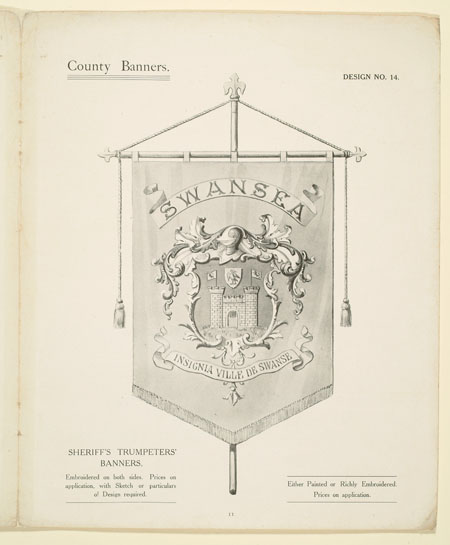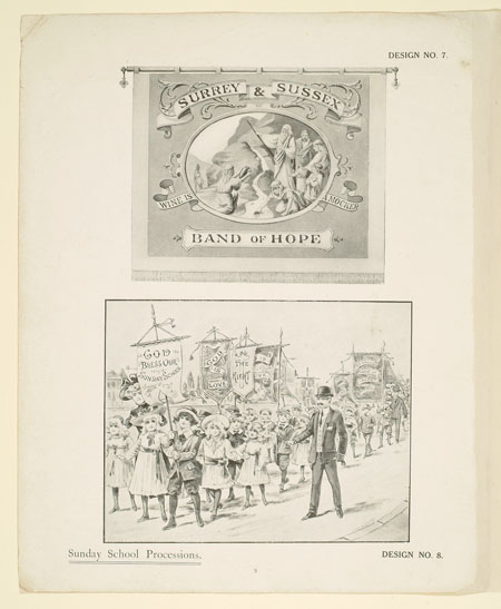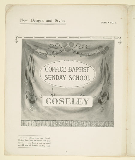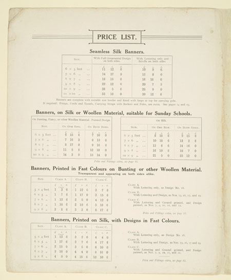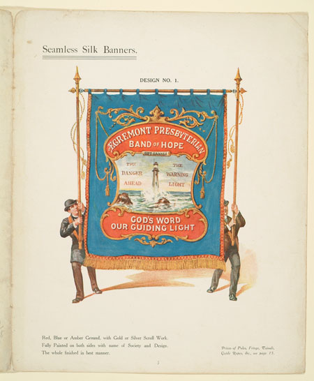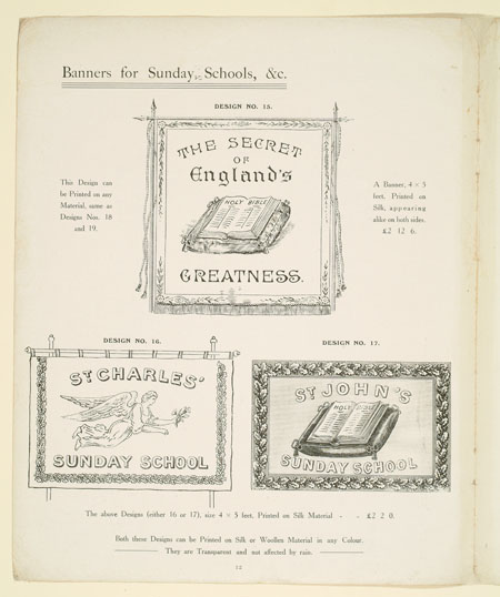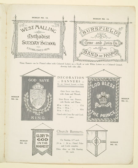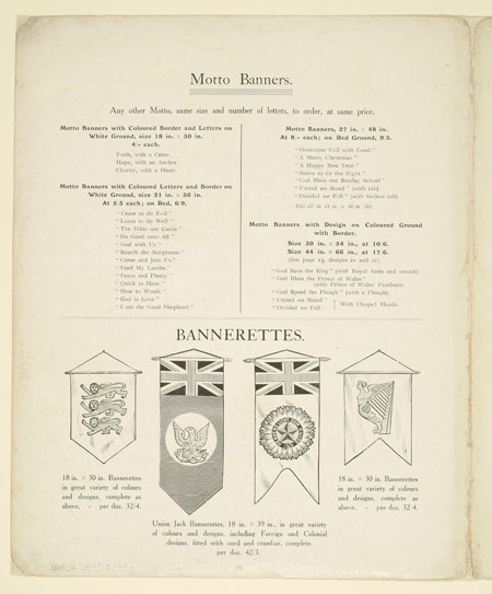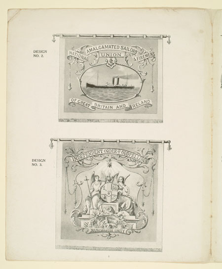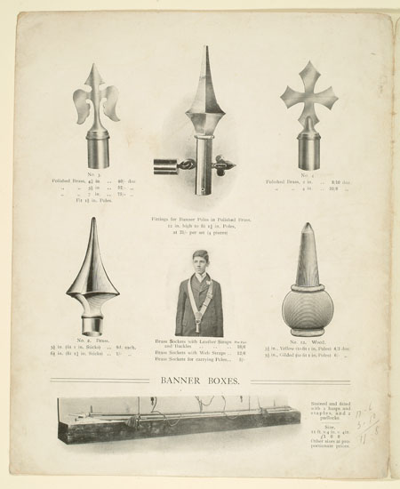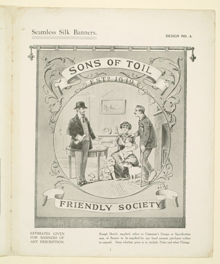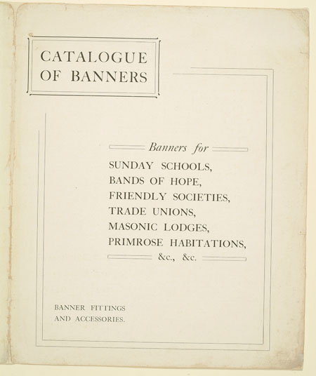 Many organisations from trade unions and friendly societies to temperance societies and Primrose habitations ordered banners to promote and celebrate their cause. This sales catalogue advertises banners and accessories from the banner maker Turtle and Pearce, the successor to George Tutill's banner company. The catalogue includes examples of banners, bannerettes, finials and the large banner boxes made for transporting the finished piece. Banners could be printed "on silk, on bunting or other woollen material" in a range of sizes and often featured coats of arms, biblical scenes, landscapes, workplaces or the sick worker and his family being visited by the union official.