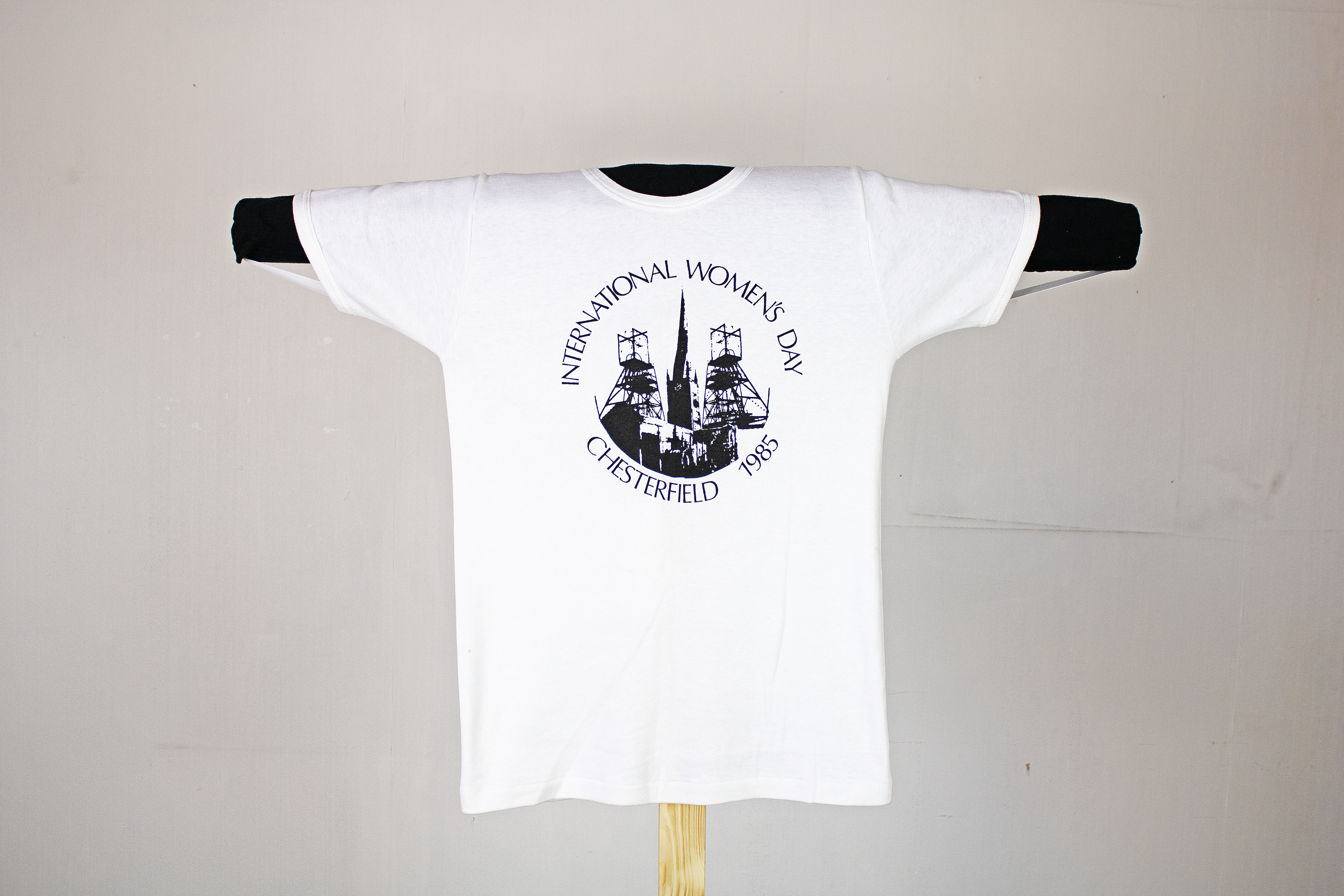 A t-shirt with a pit head winding machine on front, text reads: "INTERNATIONAL WOMEN'S DAY CHESTERFIELD 1985". This t-shirt was made by Women Against Pit Closures (WAPC) Chesterfield ahead of a WAPC national rally for IWD in 1985. Chestefield hosted the event which saw hundreds of women unite behind the miners. Arthur Scargill, leader of the National Union of Mineworkers (NUM) also attended the rally in order to thank the women for their support.