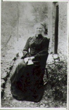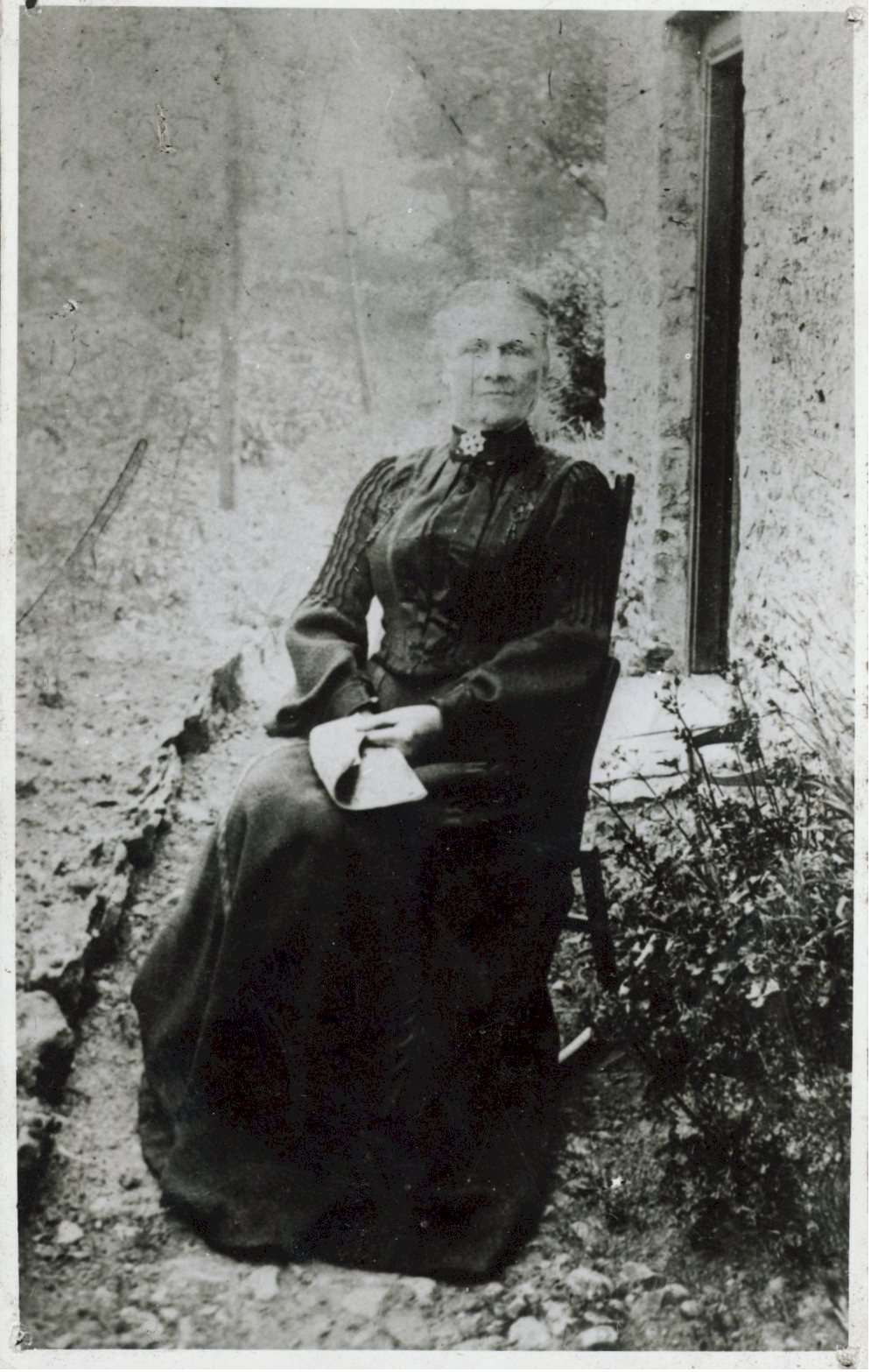 A black and white photograph of Rebecca Smith sat by a door to a cottage.