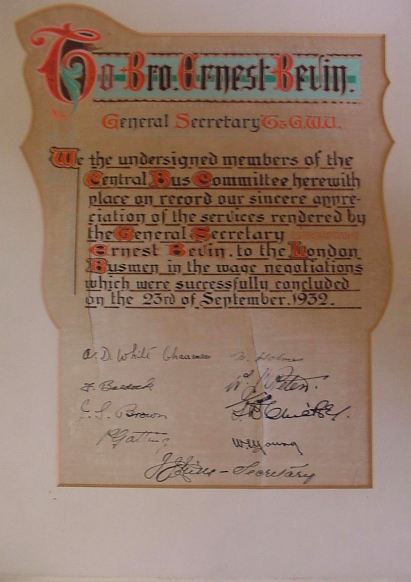 To Bro Ernest Bevin General Secretary T&GWU. We The Undersigned Members Of The Central Bus Committee Herewith Place On Record Our Sincere Appreciation Of The Services Rendered... 23rd September 1932