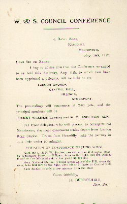 W.& S. Council Conference, 4 Banff Road, Rusholme, Manchester, Aug. 10th 1917. Dear Sir Madam...Labour Church...