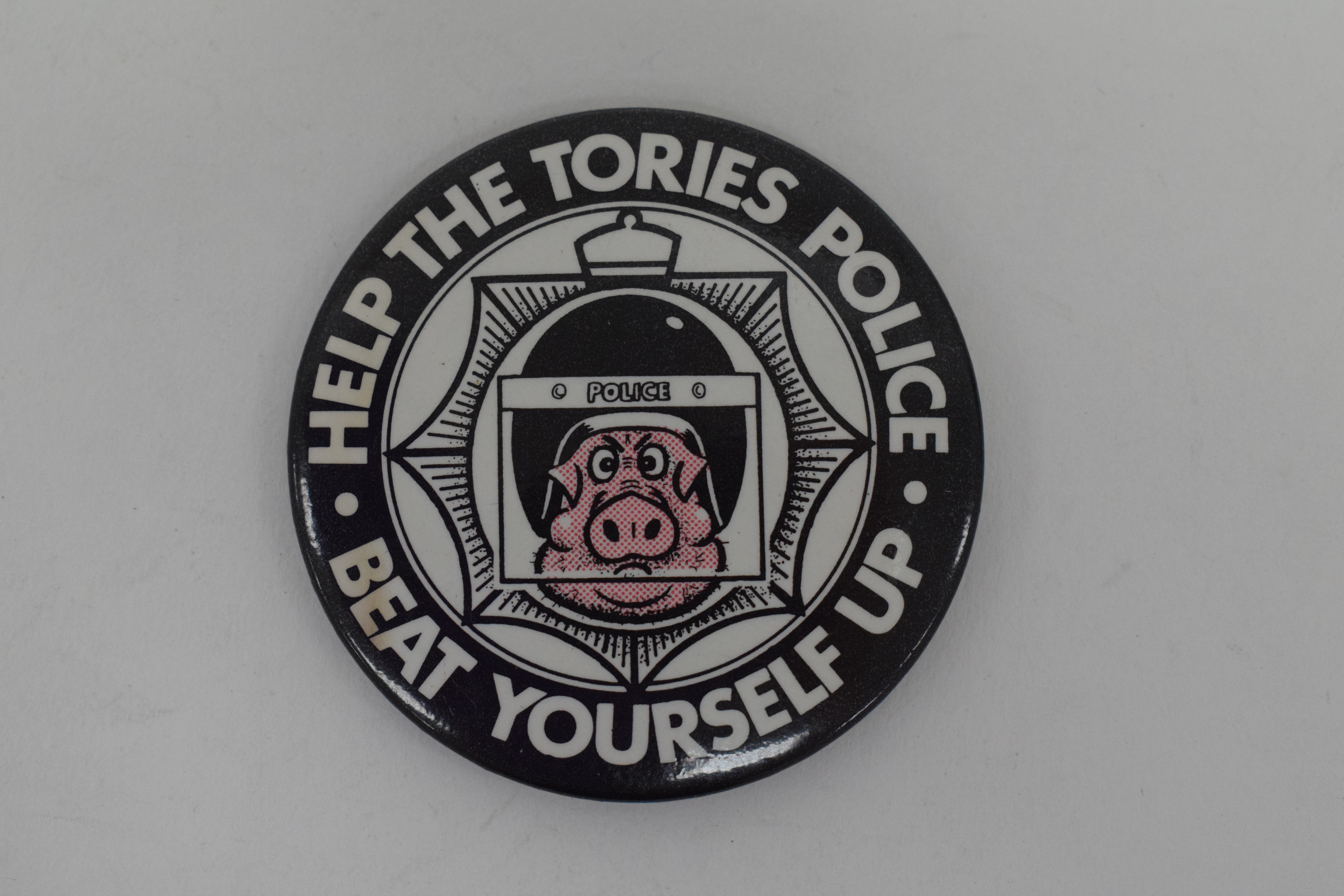 "Help The Tories Police, Beat Yourself Up badge" [NMLH.1991.14.3]