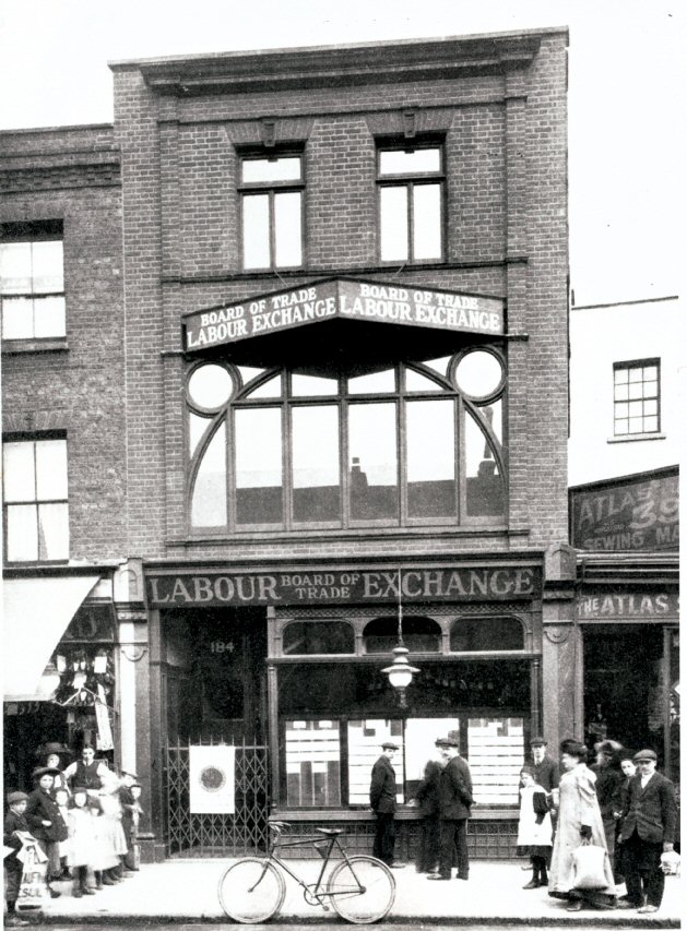 4 x identical photo prints: exterior shot of Camberwell Labour Exchange, 1910. Children and adults and bicycle at front.